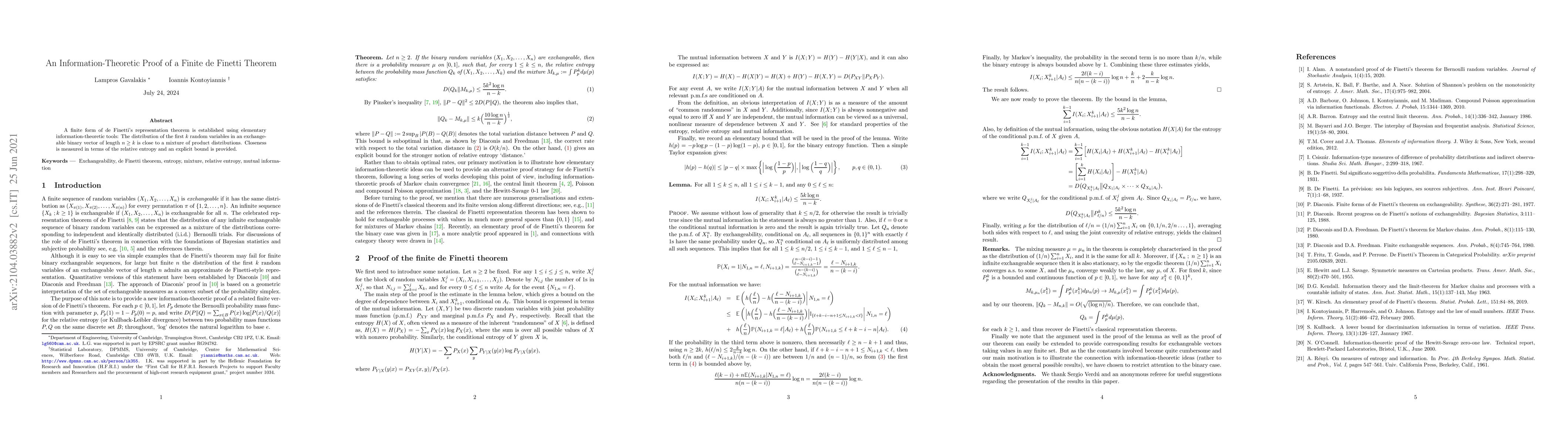 This paper proves a finite version of de Finetti's theorem using information theory, showing that the first $k$ variables in an exchangeable binary sequence of length $n \geq k$ approximates a mixture of product distributions, quantified by relative entropy with an explicit bound.