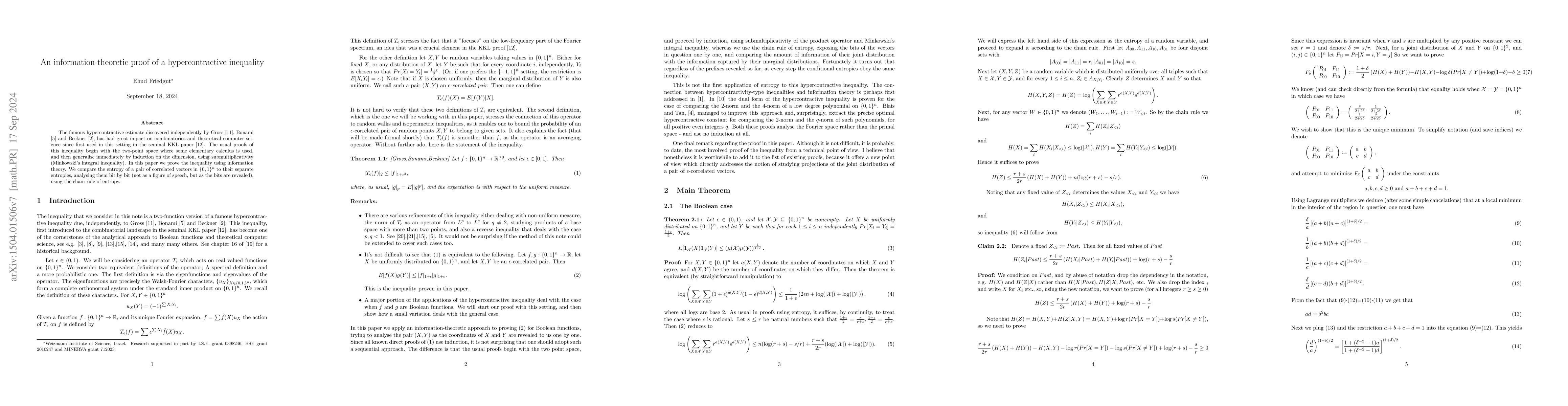 The paper provides an information-theoretic proof of the Bonami-Beckner-Gross hypercontractive inequality using entropy, the chain rule, and Minkowski's integral inequality, contrasting with previous proofs that relied on induction and submultiplicativity of the product operator.