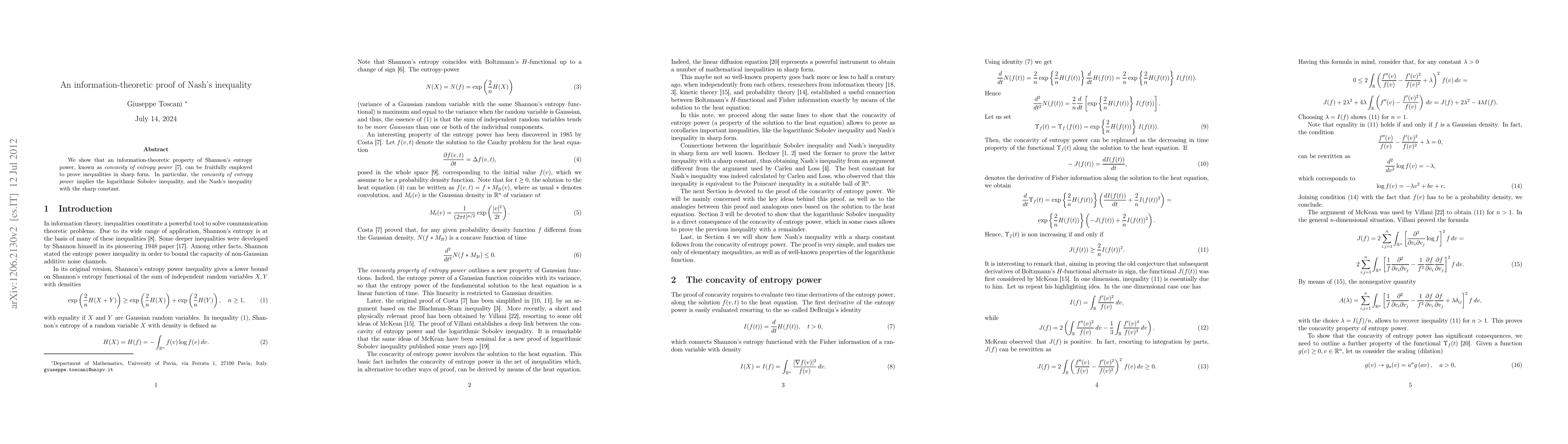 Two-line summary: This paper leverages the concavity property of Shannon's entropy power to derive Nash's inequality with the optimal constant. It demonstrates that information-theoretic properties of entropy power can provide sharp forms of classical inequalities, specifically establishing the logarithmic Sobolev inequality as a consequence.