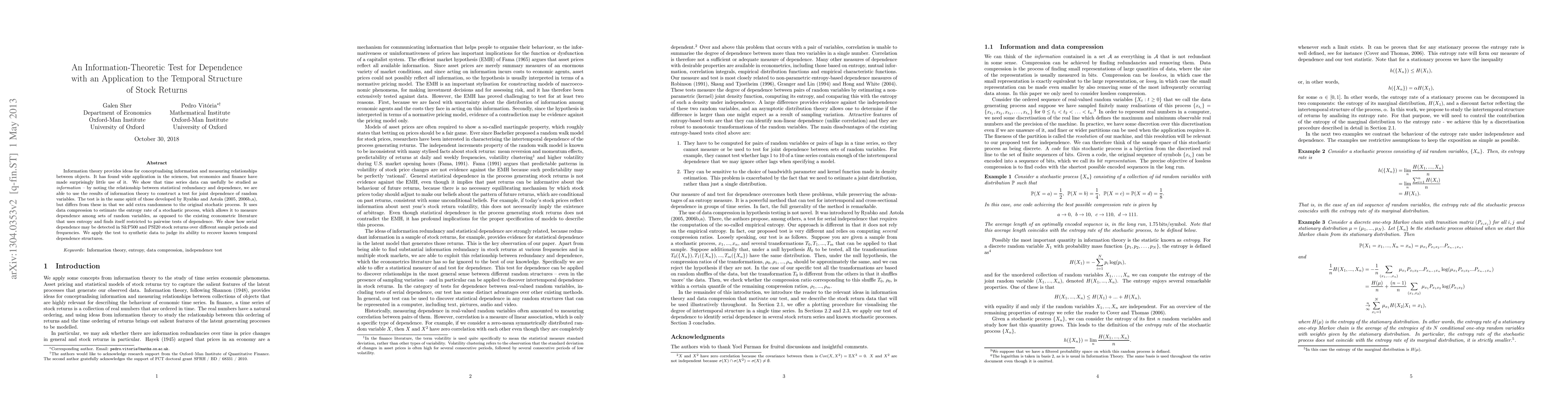 Information theory provides ideas for conceptualising information and measuring relationships between objects. It has found wide application in the sciences, but economics and finance have made surprisingly little use of it. We show that time series data can usefully be studied as information -- by noting the relationship between statistical redundancy and dependence, we are able to use the results of information theory to construct a test for joint dependence of random variables. The test is in the same spirit of those developed by Ryabko and Astola (2005, 2006b,a), but differs from these in that we add extra randomness to the original stochatic process. It uses data compression to estimate the entropy rate of a stochastic process, which allows it to measure dependence among sets of random variables, as opposed to the existing econometric literature that uses entropy and finds itself restricted to pairwise tests of dependence. We show how serial dependence may be detected in S&P500 and PSI20 stock returns over different sample periods and frequencies. We apply the test to synthetic data to judge its ability to recover known temporal dependence structures.