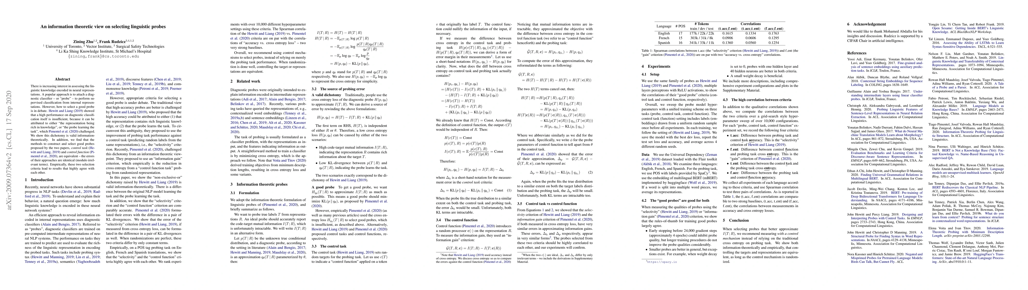 There is increasing interest in assessing the linguistic knowledge encoded in neural representations. A popular approach is to attach a diagnostic classifier -- or "probe" -- to perform supervised classification from internal representations. However, how to select a good probe is in debate. Hewitt and Liang (2019) showed that a high performance on diagnostic classification itself is insufficient, because it can be attributed to either "the representation being rich in knowledge", or "the probe learning the task", which Pimentel et al. (2020) challenged. We show this dichotomy is valid information-theoretically. In addition, we find that the methods to construct and select good probes proposed by the two papers, *control task* (Hewitt and Liang, 2019) and *control function* (Pimentel et al., 2020), are equivalent -- the errors of their approaches are identical (modulo irrelevant terms). Empirically, these two selection criteria lead to results that highly agree with each other.