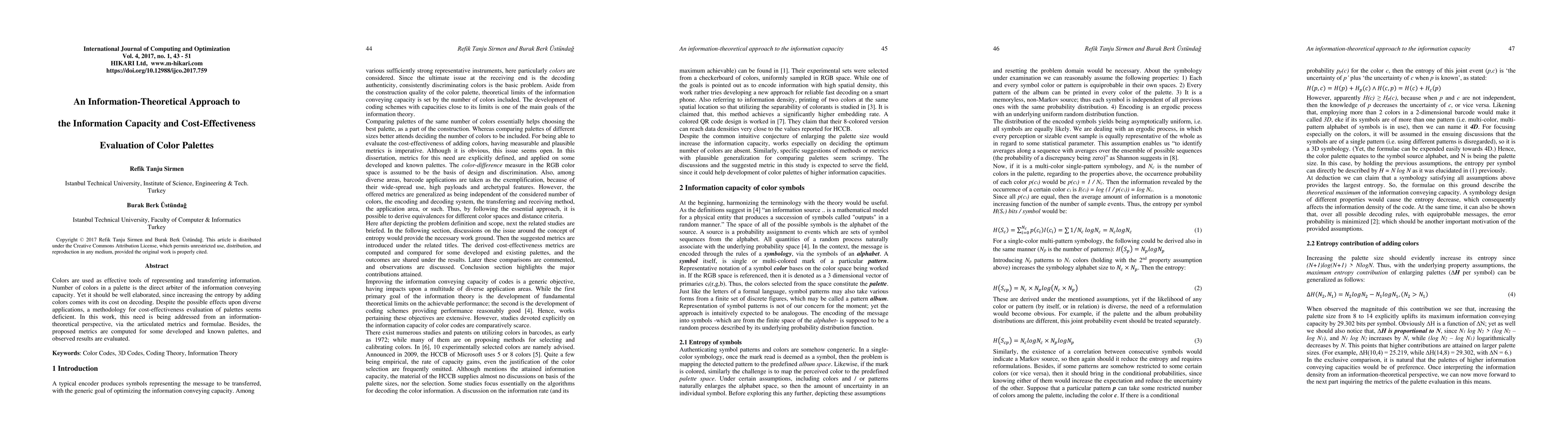 Colors are used as effective tools of representing and transferring information. Number of colors in a palette is the direct arbiter of the information conveying capacity. Yet it should be well elaborated, since increasing the entropy by adding colors comes with its cost on decoding. Despite the possible effects upon diverse applications, a methodology for cost-effectiveness evaluation of palettes seems deficient. In this work, this need is being addressed from an information-theoretical perspective, via the articulated metrics and formulae. Besides, the proposed metrics are computed for some developed and known palettes, and observed results are evaluated.