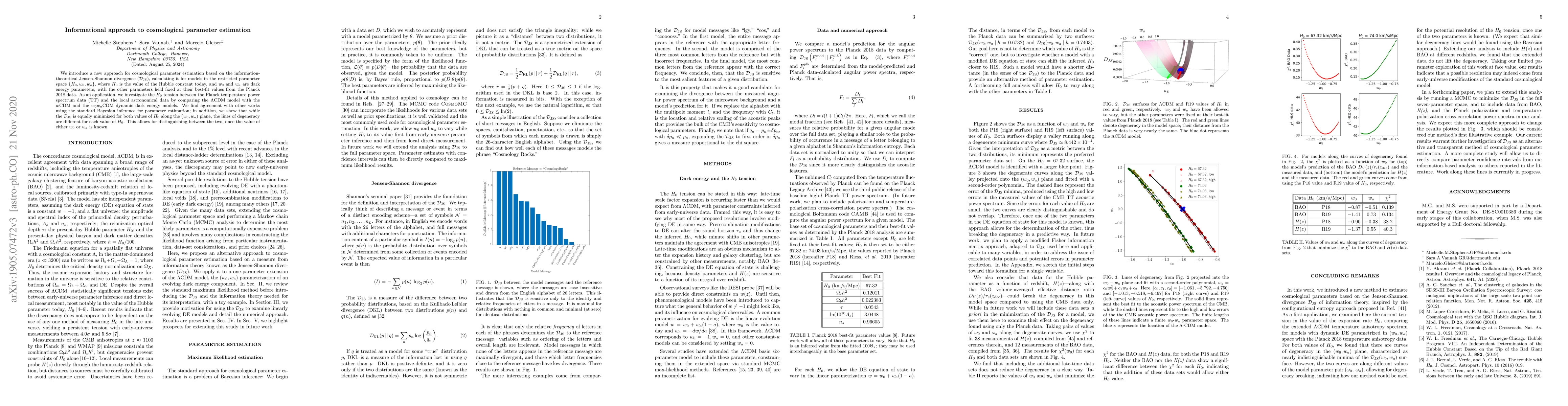 We introduce a new approach for cosmological parameter estimation based on the information-theoretical Jensen-Shannon divergence (${\cal D}_{\rm JS}$), calculating it for models in the restricted parameter space $\{H_0, w_0, w_a\}$, where $H_0$ is the value of the Hubble constant today, and $w_0$ and $w_a$ are dark energy parameters, with the other parameters held fixed at their best-fit values from the Planck 2018 data. As an application, we investigate the $H_0$ tension between the Planck temperature power spectrum data (TT) and the local astronomical data by comparing the $\Lambda$CDM model with the $w$CDM and the $w_0w_a$CDM dynamic dark energy models. We find agreement with other works using the standard Bayesian inference for parameter estimation; in addition, we show that while the ${\cal D}_{\rm JS}$ is equally minimized for both values of $H_0$ along the $(w_0,w_a)$ plane, the lines of degeneracy are different for each value of $H_0$. This allows for distinguishing between the two, once the value of either $w_0$ or $w_a$ is known.
