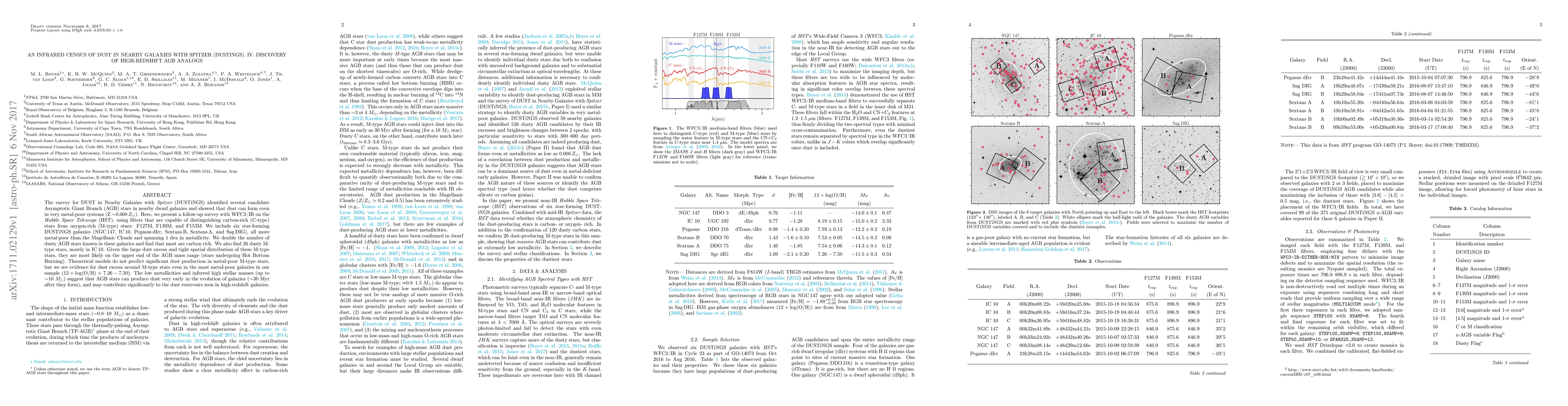 The DUSTiNGS survey identified carbon-rich Asymptotic Giant Branch (AGB) stars in nearby dwarf galaxies, revealing dust formation in metal-poor systems. A follow-up survey using HST's WFC3/IR doubled the number of dusty AGB stars, showing most are carbon-rich and suggesting AGB stars can produce dust early in galaxy evolution.