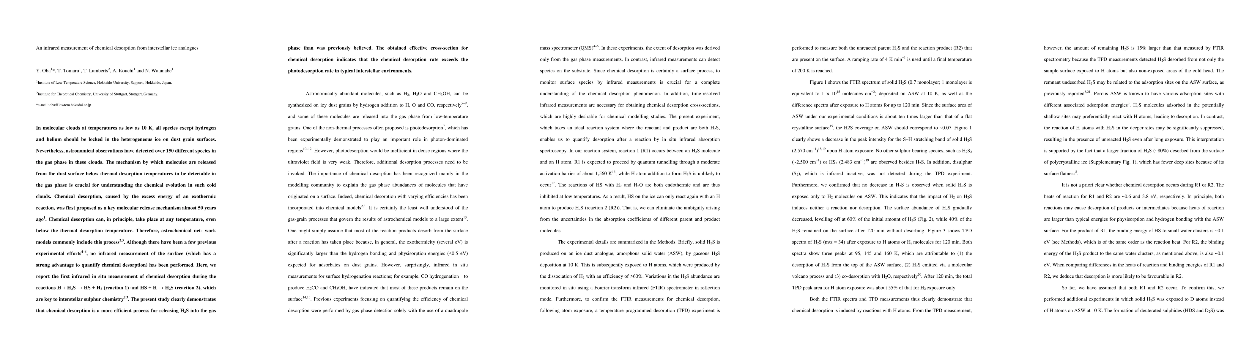 This paper reports the first infrared measurement of chemical desorption from interstellar ice analogues, demonstrating that chemical desorption is more efficient than previously believed for releasing H2S into the gas phase. The study finds that the chemical desorption rate exceeds the photodesorption rate in typical interstellar environments, providing crucial insights into the chemical evolution in cold molecular clouds.