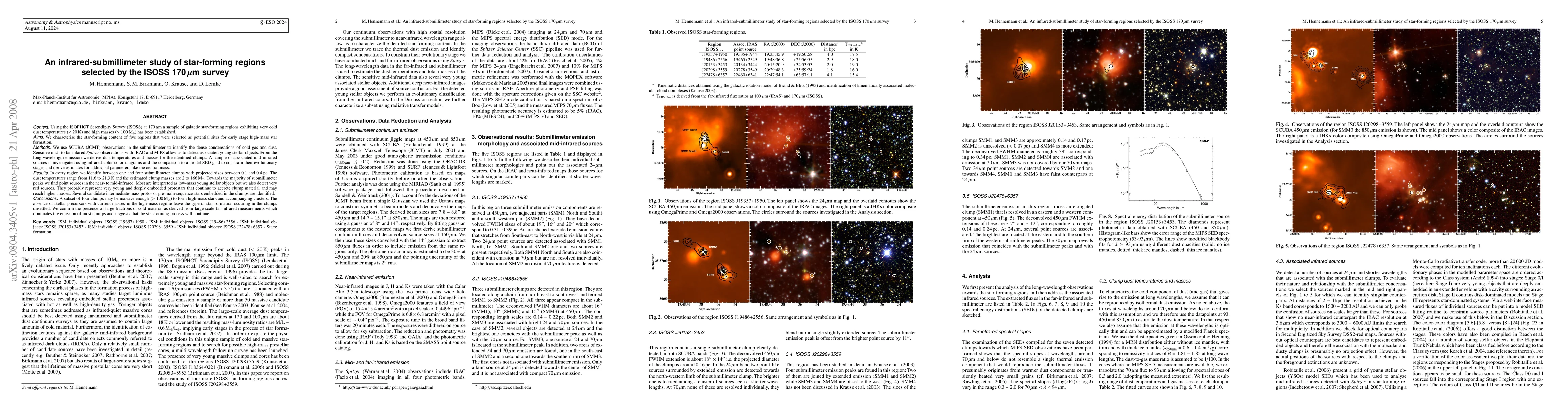 The study, using ISOSS and SCUBA observations, identifies five cold, massive star-forming regions with submillimeter clumps. These clumps host low-mass YSOs, very red sources indicating young protostars, and potential intermediate-mass stars. Some clumps are massive enough to form high-mass stars, though the process remains unclear due to missing stellar precursors. Cold material dominates the clump emission, suggesting ongoing star formation.