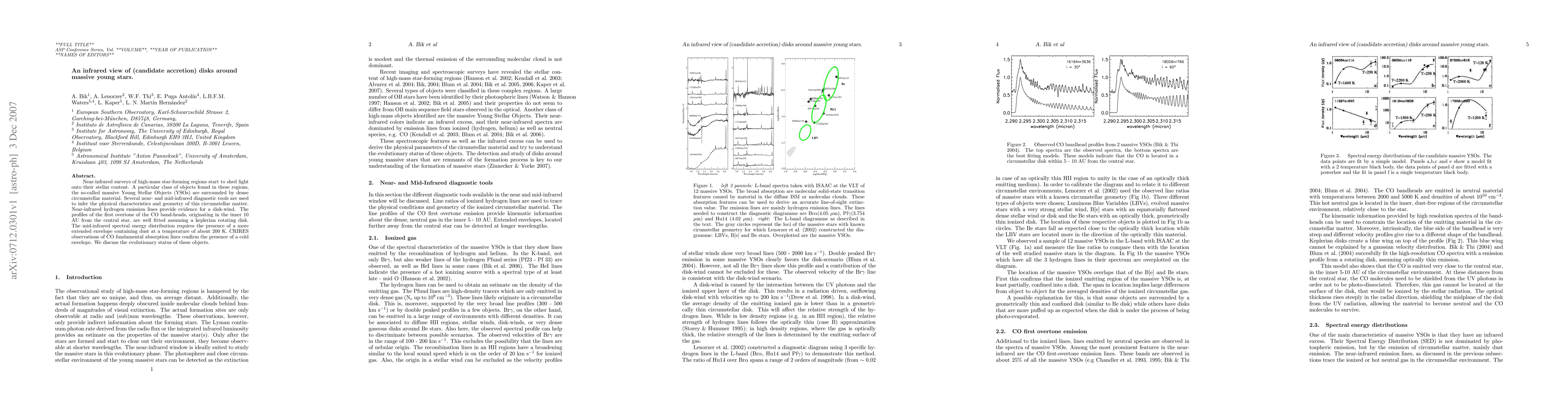 Near-infrared surveys of high-mass star-forming regions start to shed light onto their stellar content. A particular class of objects found in these regions, the so-called massive Young Stellar Objects (YSOs) are surrounded by dense circumstellar material. Several near- and mid-infrared diagnostic tools are used to infer the physical characteristics and geometry of this circumstellar matter. Near-infrared hydrogen emission lines provide evidence for a disk-wind. The profiles of the first overtone of the CO band-heads, originating in the inner 10 AU from the central star, are well fitted assuming a keplerian rotating disk. The mid-infrared spectral energy distribution requires the presence of a more extended envelope containing dust at a temperature of about 200 K. CRIRES observations of CO fundamental absorption lines confirm the presence of a cold envelope. We discuss the evolutionary status of these objects.