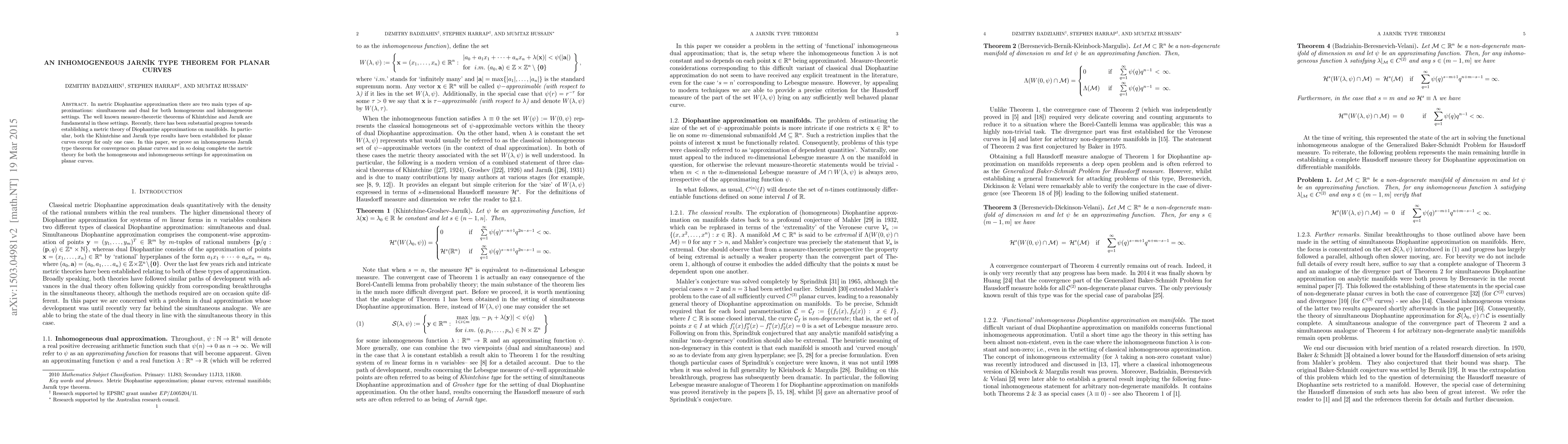Researchers prove an inhomogeneous Jarnik type theorem for planar curves, completing a metric theory of Diophantine approximations on these shapes, both in homogeneous and inhomogeneous settings.