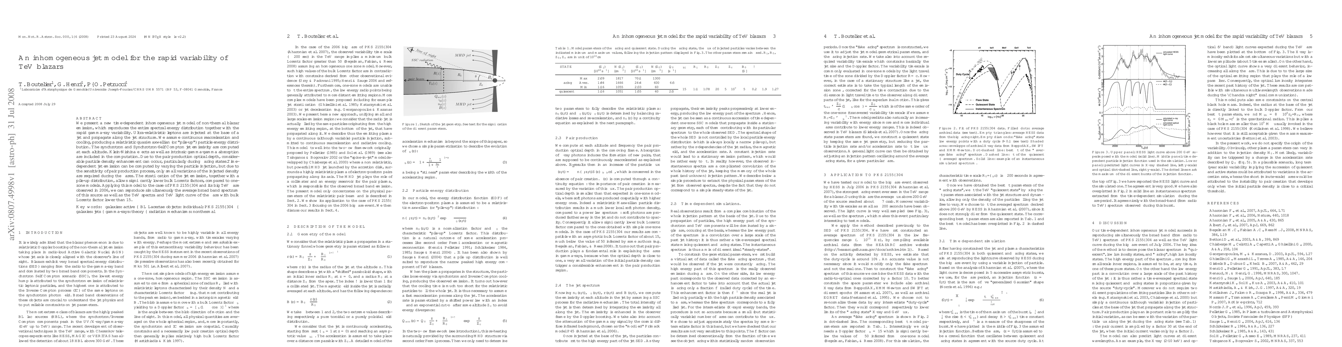 We present a new time-dependent inhomogeneous jet model of non-thermal blazar emission, which reproduces the entire spectral energy distribution together with the rapid gamma-ray variability. Ultra-relativistic leptons are injected at the base of a jet and propagate along the jet structure. We assume continuous reacceleration and cooling, producing a relativistic quasi-maxwellian (or "pile-up") particle energy distribution. The synchrotron and Synchrotron-Self Compton jet emissivity are computed at each altitude. Klein-Nishina effects as well as intrinsic gamma-gamma absorption are included in the computation. Due to the pair production optical depth, considerable particle density enhancement can occur, particularly during flaring states. Time-dependent jet emission can be computed by varying the particle injection, but due to the sensitivity of pair production process, only small variations of the injected density are required during the flares. The stratification of the jet emission, together with a pile-up distribution, allows significantly lower bulk Lorentz factors, compared to one-zone models. Applying this model to the case of PKS2155-304 and its big TeV flare observed in 2006, we can reproduce simultaneously the average broad band spectrum of this source as well as the TeV spectra and TeV light curve of the flare with bulk Lorentz factor lower than 15.
