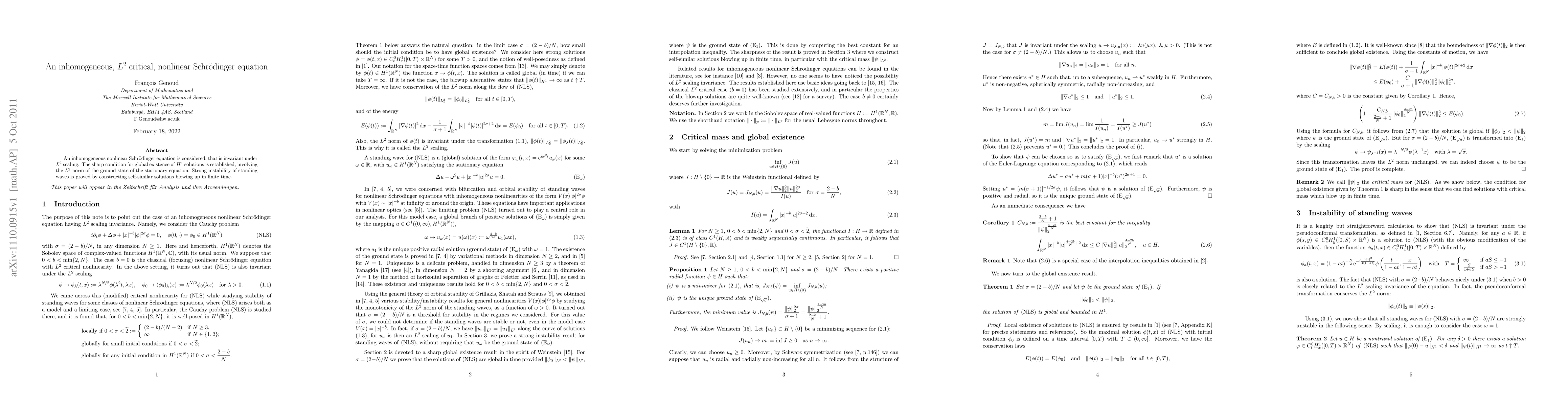 An inhomogeneous nonlinear Schr\"odinger equation is considered, that is invariant under $L^2$ scaling. The sharp condition for global existence of $H^1$ solutions is established, involving the $L^2$ norm of the ground state of the stationary equation. Strong instability of standing waves is proved by constructing self-similar solutions blowing up in finite time.
