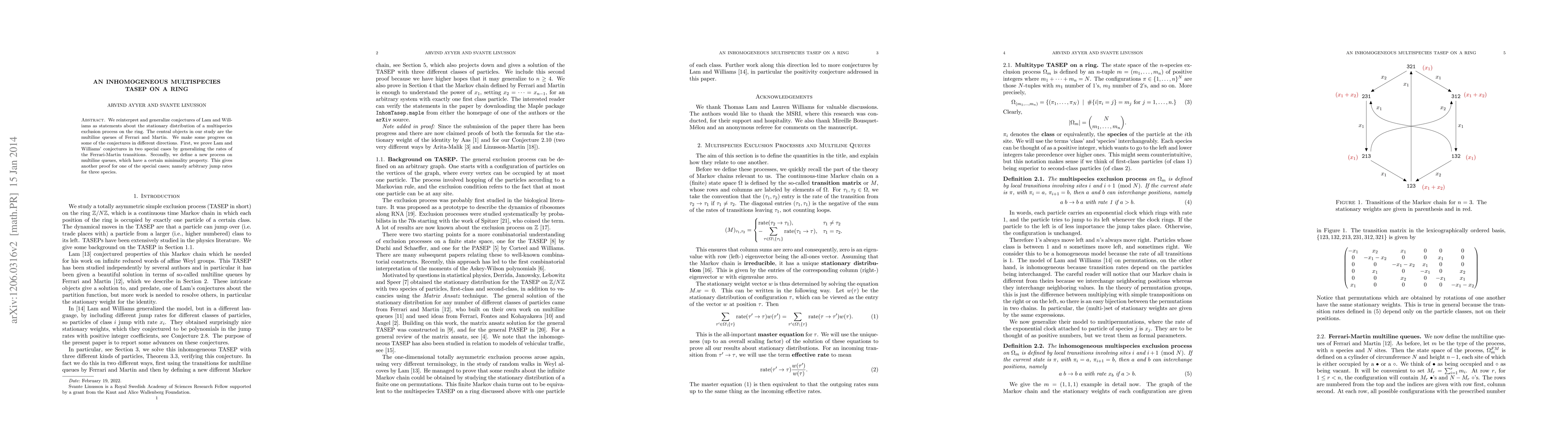 This paper generalizes conjectures about the stationary distribution of a multispecies exclusion process on a ring, proving them in two special cases and introducing a new minimality property process for multiline queues. It also provides an alternative proof for the case of arbitrary jump rates for three species.