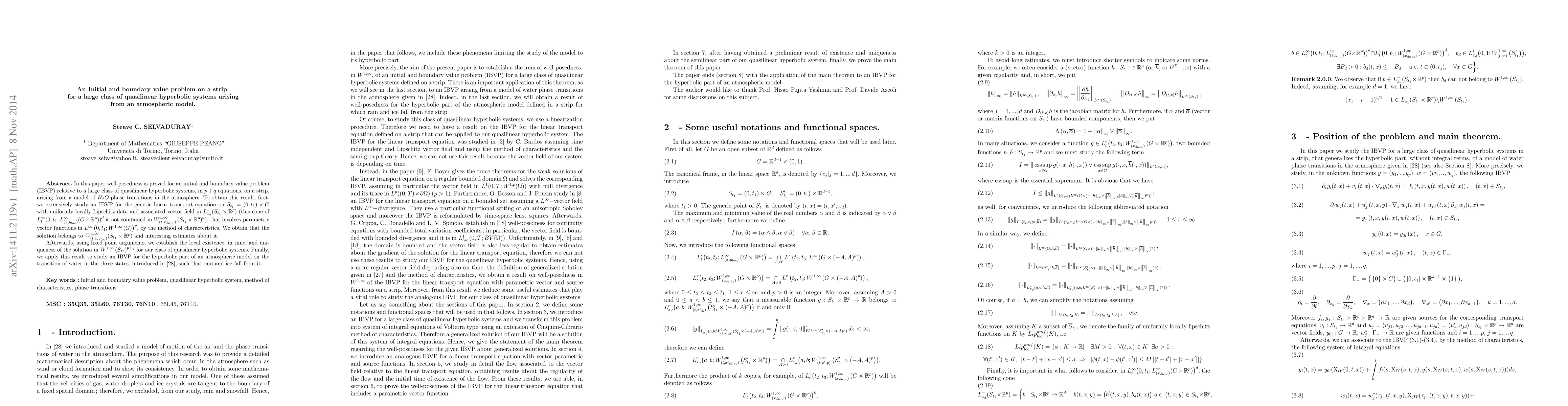 In this paper well-posedness is proved for an initial and boundary value problem (IBVP) relative to a large class of quasilinear hyperbolic systems, in $p+q$ equations, on a strip, arising from a model of $H_2O$-phase transitions in the atmosphere. To obtain this result, first, we extensively study an IBVP for the generic linear transport equation on $S_{t_1 } = (0,t_1 ) \times G$ with uniformly locally Lipschitz data and associated vector field in $L_{x_d }^{-} (S_{t_1 } \times \mathbb{R}^p )$ (this cone of $L_t^\infty (0,t_1 ;L_{(x,y_{loc} )}^\infty (G \times \mathbb{R}^p ))^d $ is not cointained in $W^{1,\infty }_{\left( {t,x,y_{loc} } \right)} \left( {S_{t_1} \times \mathbb{R}^p} \right)^d$), that involves parametric vector functions in $ L^\infty \left( {0,t_1;W^{1,\infty } \left( G \right)} \right)^p$, by the method of characteristics. We obtain that the solution belongs to $W_{(t,x,y_{loc} )}^{1,\infty } (S_{t_1 } \times \mathbb{R}^p )$ and interesting estimates about it. Afterwards, using fixed point arguments, we establish the local existence, in time, and uniqueness of the solution in $W^{1,\infty } \left( {S_{t^* } } \right)^{p+q}$ for our class of quasilinear hyperbolic systems. Finally, we apply this result to study an IBVP for the hyperbolic part of an atmospheric model on the transition of water in the three states, introduced in \cite{[SF]}, such that rain and ice fall from it.