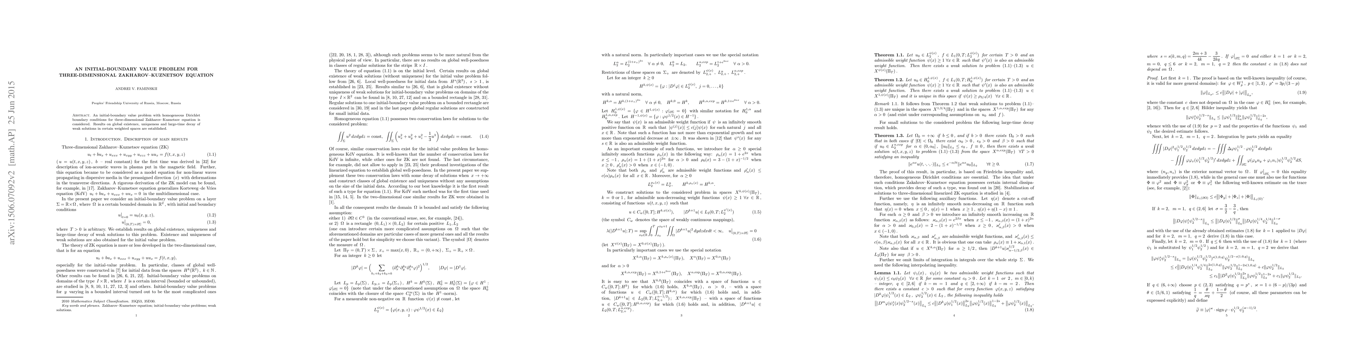 This paper investigates an initial-boundary value problem for the three-dimensional Zakharov-Kuznetsov equation with homogeneous Dirichlet boundary conditions, establishing global existence, uniqueness, and large-time decay of weak solutions in specified weighted spaces.
