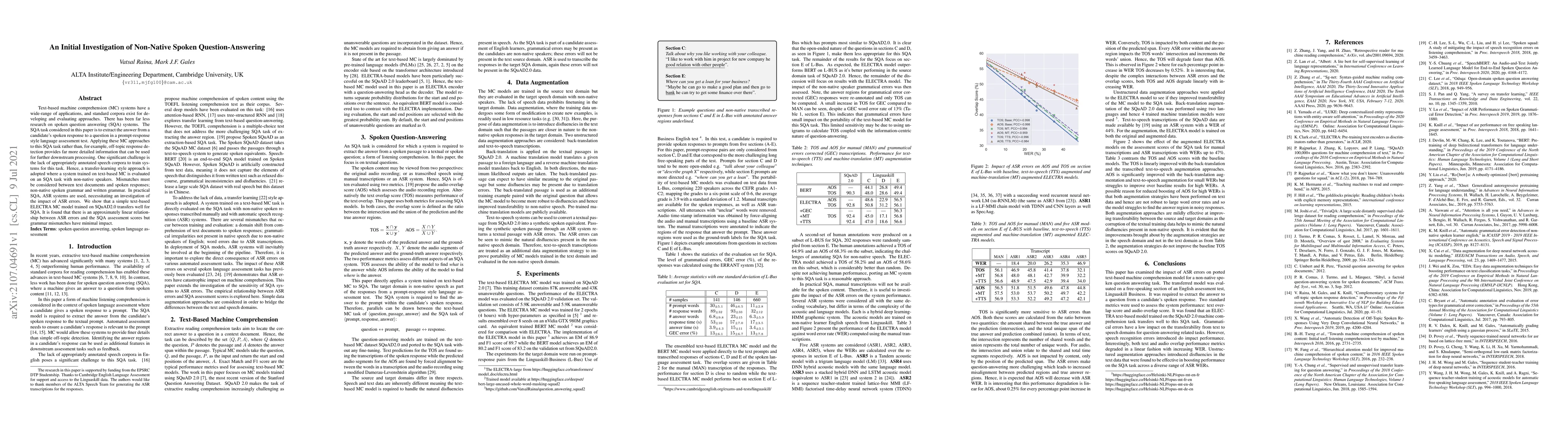 This paper investigates the application of text-based machine comprehension models to spoken question-answering tasks involving non-native speakers. The study finds that a text-based ELECTRA model trained on SQuAD2.0 performs well in this context, with ASR errors showing a linear relationship to SQA assessment scores, while grammar mismatches have minimal impact.