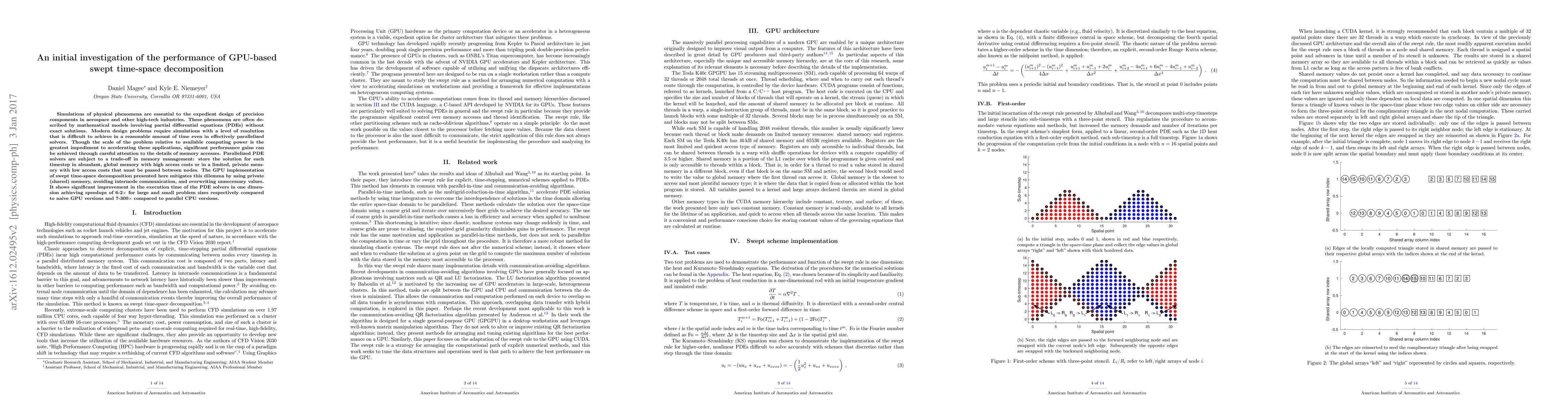 This paper investigates GPU-based swept time-space decomposition for solving PDEs, showing significant performance improvements by utilizing private memory and avoiding internode communication, achieving speedups of 6-2x over naive GPU versions and 7-300x over parallel CPU versions.