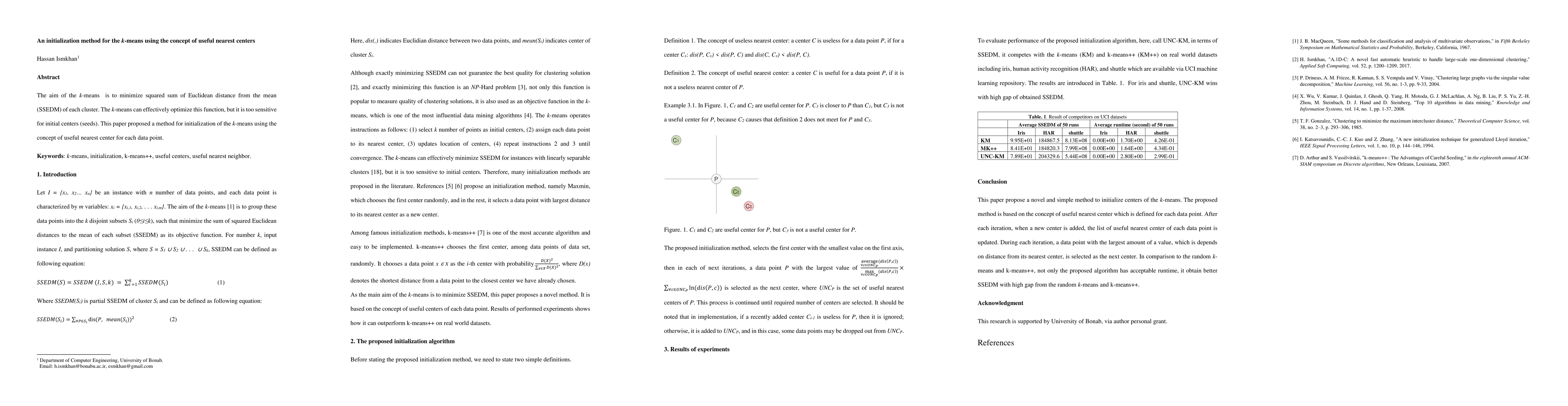 This paper proposes a novel initialization method for the k-means clustering algorithm that leverages the concept of useful nearest centers to improve the sensitivity to initial seeds. The method aims to optimize the minimization of the squared sum of Euclidean distances from the cluster mean.