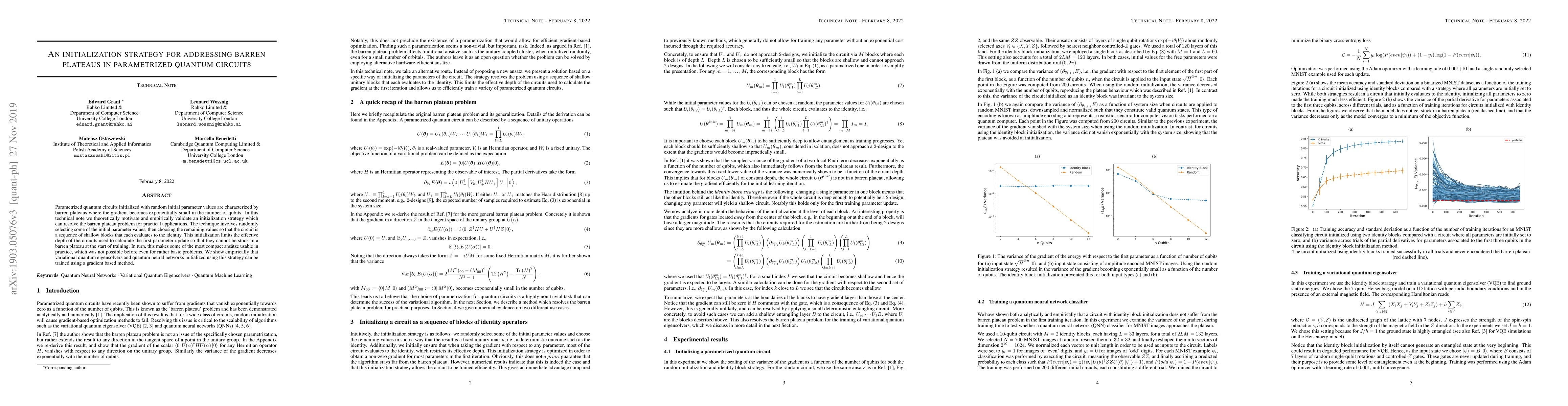 This paper proposes an initialization strategy to overcome barren plateaus in parametrized quantum circuits by setting initial parameters to ensure the circuit acts as a sequence of shallow identity-evaluating blocks. This method effectively limits the depth of initial circuits, enabling successful training of variational quantum eigensolvers and quantum neural networks using gradient-based methods.