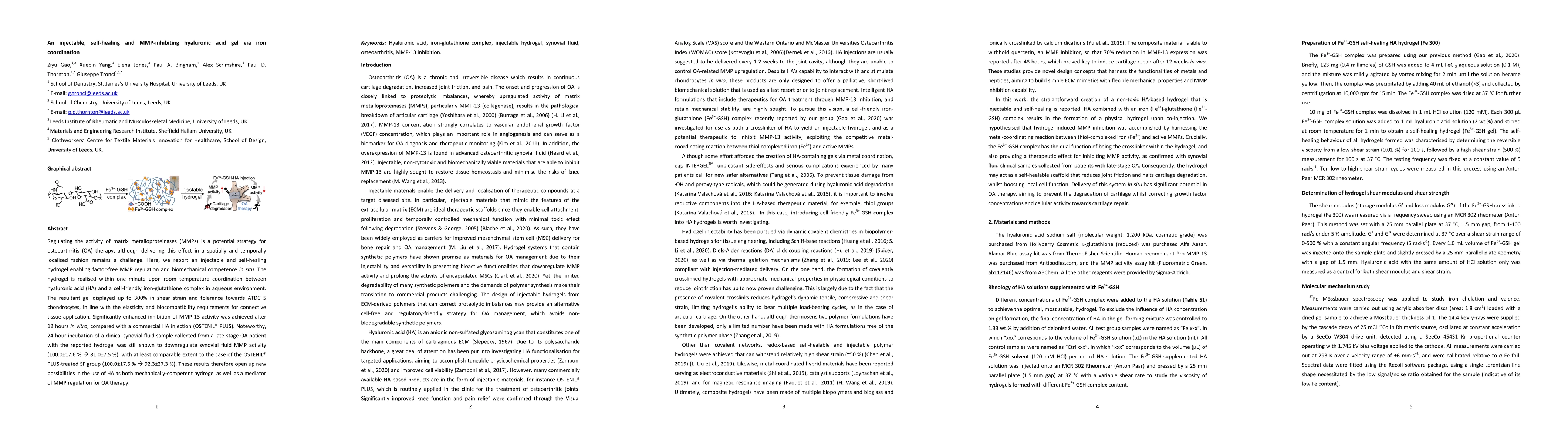 Regulating the activity of matrix metalloproteinases (MMPs) is a potential strategy for osteoarthritis (OA) therapy, although delivering this effect in a spatially and temporally localised fashion remains a challenge. Here, we report an injectable and self-healing hydrogel enabling factor-free MMP regulation and biomechanical competence in situ. The hydrogel is realised within one minute upon room temperature coordination between hyaluronic acid (HA) and a cell-friendly iron-glutathione complex in aqueous environment. The resultant gel displayed up to 300% in shear strain and tolerance towards ATDC 5 chondrocytes, in line with the elasticity and biocompatibility requirements for connective tissue application. Significantly enhanced inhibition of MMP-13 activity was achieved after 12 hours in vitro, compared with a commercial HA injection (OSTENIL PLUS). Noteworthy, 24-hour incubation of a clinical synovial fluid sample collected from a late-stage OA patient with the reported hydrogel was still shown to downregulate synovial fluid MMP activity (100.0 +/- 17.6 % --> 81.0 +/- 7.5 %), with at least comparable extent to the case of the OSTENIL PLUS-treated SF group (100.0 +/- 17.6 % --> 92.3 +/- 27.3 %). These results therefore open up new possibilities in the use of HA as both mechanically-competent hydrogel as well as a mediator of MMP regulation for OA therapy.
