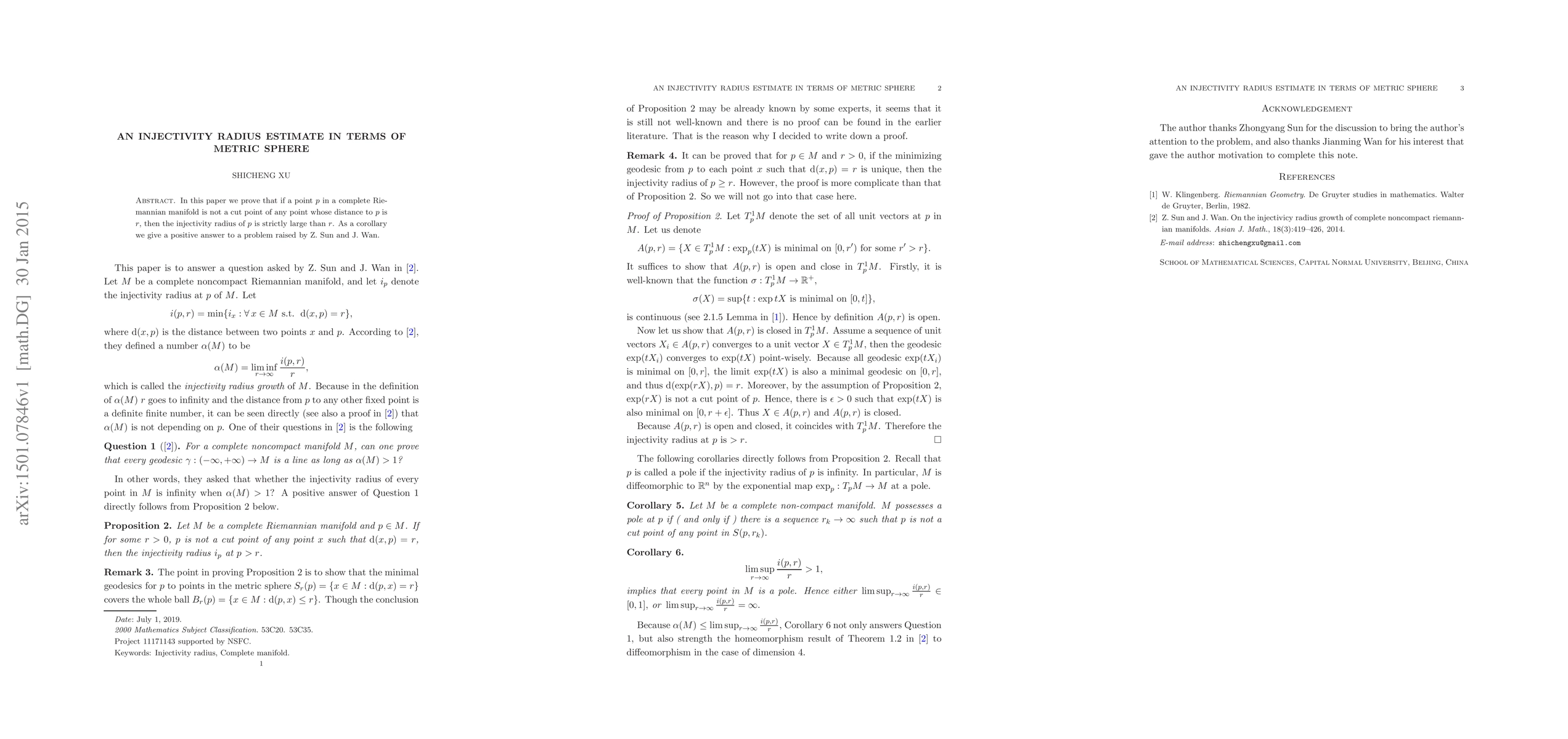 In this paper we prove that if a point $p$ in a complete Riemannian manifold is not a cut point of any point whose distance to $p$ is $r$, then the injectivity radius of $p$ is strictly large than $r$. As a corollary we give a positive answer to a problem raised by Z. Sun and J. Wan.