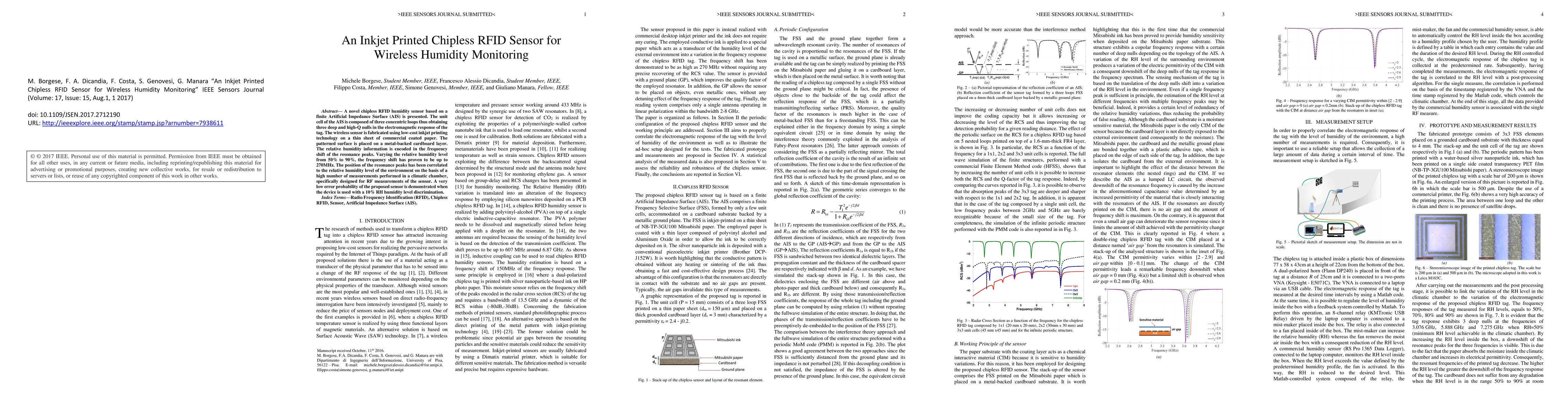 A chipless RFID sensor made from inkjet-printed technology detects humidity levels with high accuracy, measuring a 270MHz frequency shift range for relative humidity levels between 50% to 90%. The device shows a low error probability of discrimination at 10% RH.