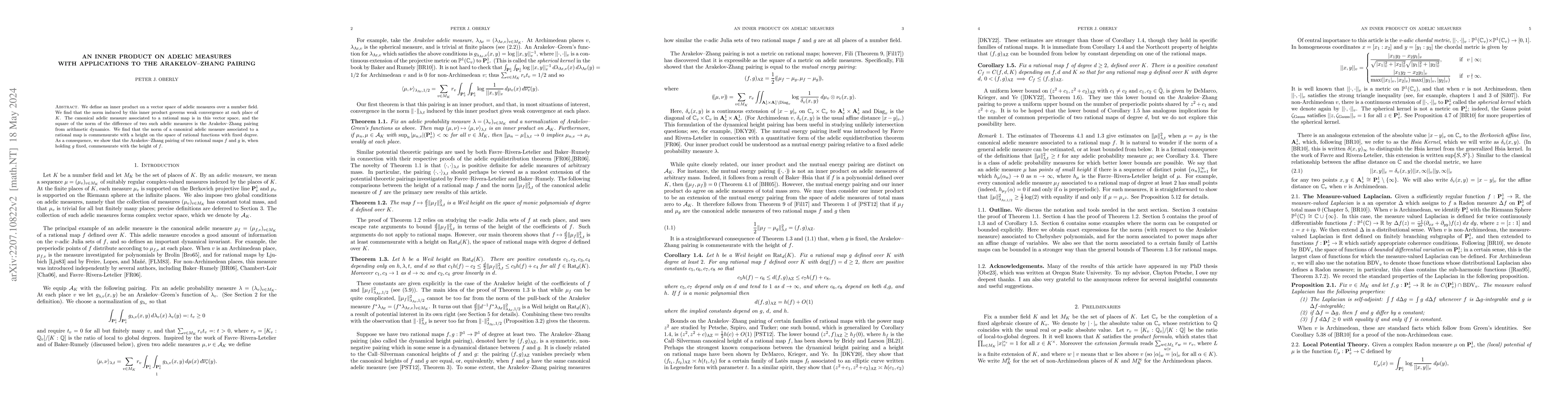 This paper defines an inner product on adelic measures, showing it governs weak convergence and relates to the Arakelov-Zhang pairing in arithmetic dynamics. It establishes a sharp lower bound for the norm of adelic measures and links the norm of canonical adelic measures to the Arakelov height of rational functions, thus bounding the Arakelov-Zhang pairing.