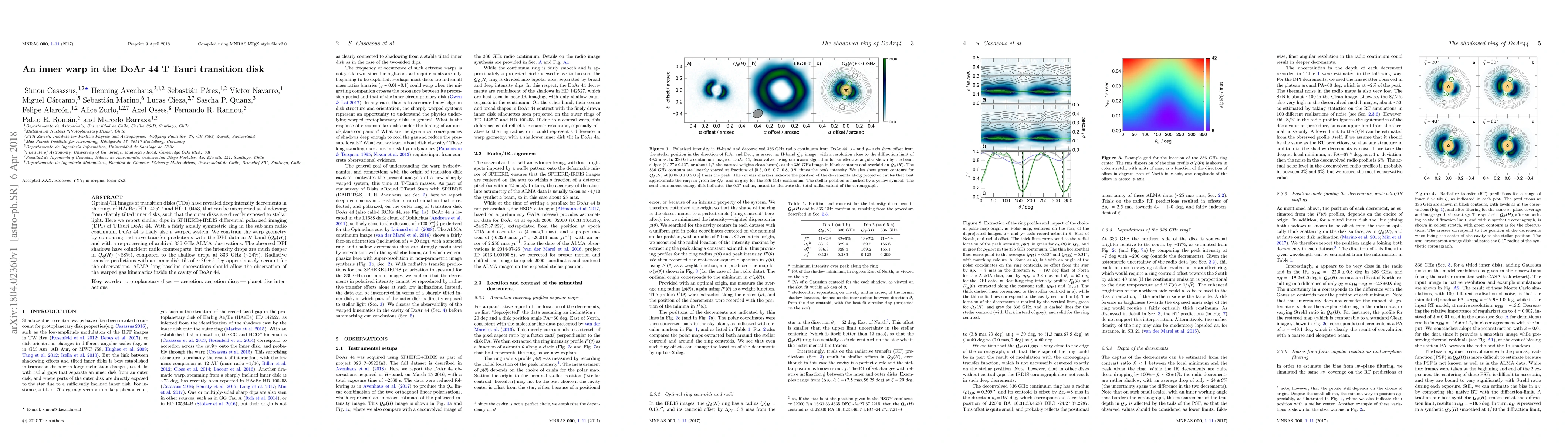 This paper reports deep intensity decrements in the disk of T Tauri star DoAr44, suggesting a warped inner disk shadowing the outer disk. Radiative transfer models suggest an inner disk tilt of ~30±5 degrees, with ALMA observations expected to reveal the warped gas kinematics.