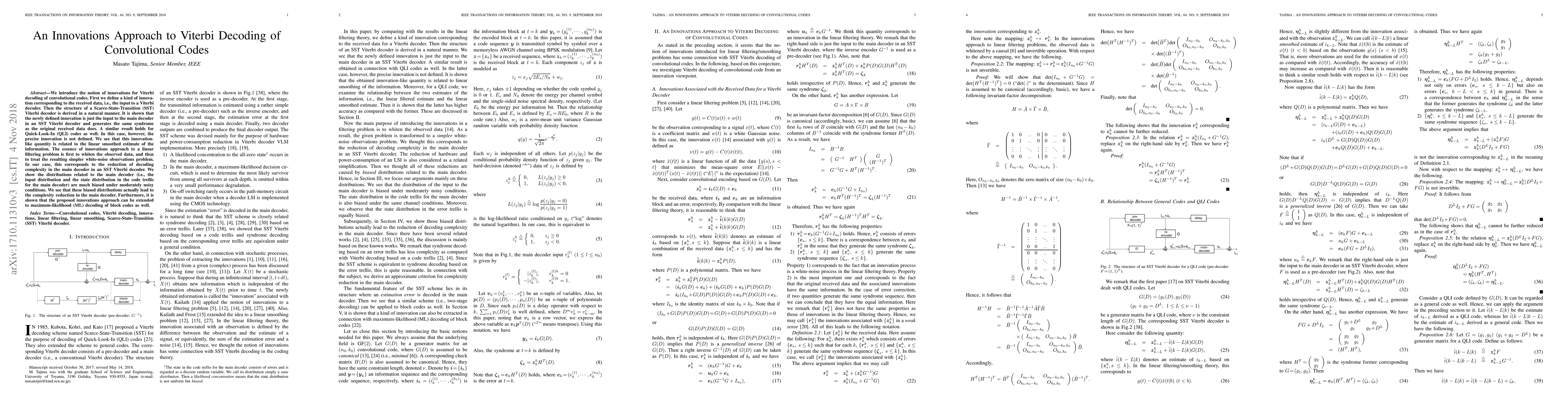 This paper introduces the concept of innovations for Viterbi decoding of convolutional codes, proposing a method that reduces decoding complexity by whitening the observed data and simplifying the problem. The innovations approach leads to biased distributions that facilitate complexity reduction in the main decoder, and it extends to maximum-likelihood decoding of block codes.