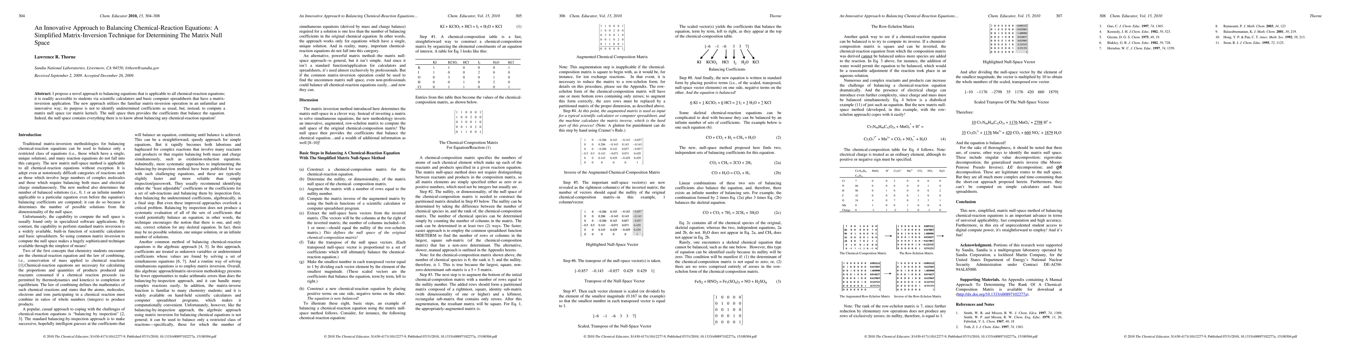 I propose a novel approach to balancing equations that is applicable to all chemical-reaction equations; it is readily accessible to students via scientific calculators and basic computer spreadsheets that have a matrix-inversion application. The new approach utilizes the familiar matrix-inversion operation in an unfamiliar and innovative way; its purpose is not to identify undetermined coefficients as usual, but, instead, to compute a matrix null space (or matrix kernel). The null space then provides the coefficients that balance the equation. Indeed, the null space contains everything there is to know about balancing any chemical-reaction equation!
