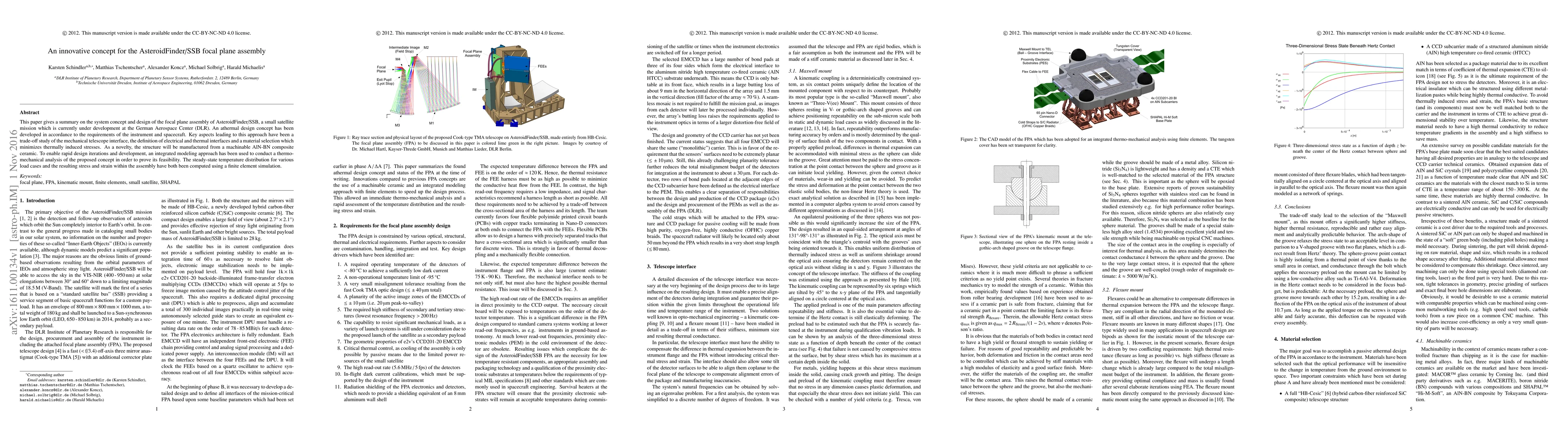 This paper gives a summary on the system concept and design of the focal plane assembly of AsteroidFinder/SSB, a small satellite mission which is currently under development at the German Aerospace Center (DLR). An athermal design concept has been developed in accordance to the requirements of the instrument and spacecraft. Key aspects leading to this approach have been a trade-off study of the mechanical telescope interface, the definition of electrical and thermal interfaces and a material selection which minimizes thermally induced stresses. As a novelty, the structure will be manufactured from a machinable AlN-BN composite ceramic. To enable rapid design iterations and development, an integrated modeling approach has been used to conduct a thermo-mechanical analysis of the proposed concept in order to prove its feasibility. The steady-state temperature distribution for various load cases and the resulting stress and strain within the assembly have both been computed using a finite element simulation.