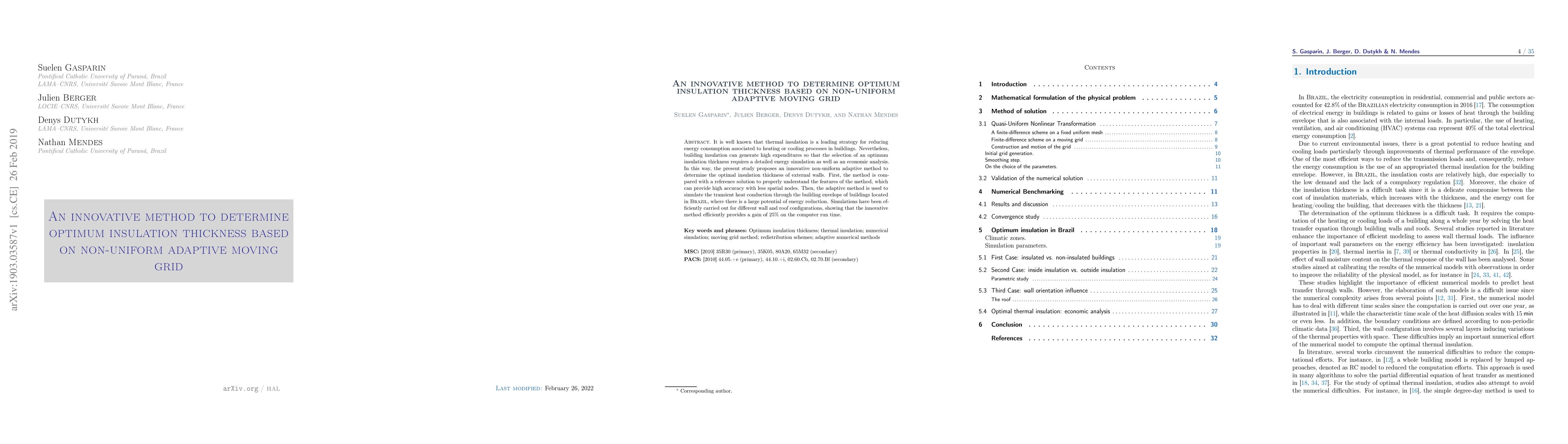It is well known that thermal insulation is a leading strategy for reducing energy consumption associated to heating or cooling processes in buildings. Nevertheless, building insulation can generate high expenditures so that the selection of an optimum insulation thickness requires a detailed energy simulation as well as an economic analysis. In this way, the present study proposes an innovative non-uniform adaptive method to determine the optimal insulation thickness of external walls. First, the method is compared with a reference solution to properly understand the features of the method, which can provide high accuracy with less spatial nodes. Then, the adaptive method is used to simulate the transient heat conduction through the building envelope of buildings located in Brazil, where there is a large potential of energy reduction. Simulations have been efficiently carried out for different wall and roof configurations, showing that the innovative method efficiently provides a gain of 25% on the computer run time.