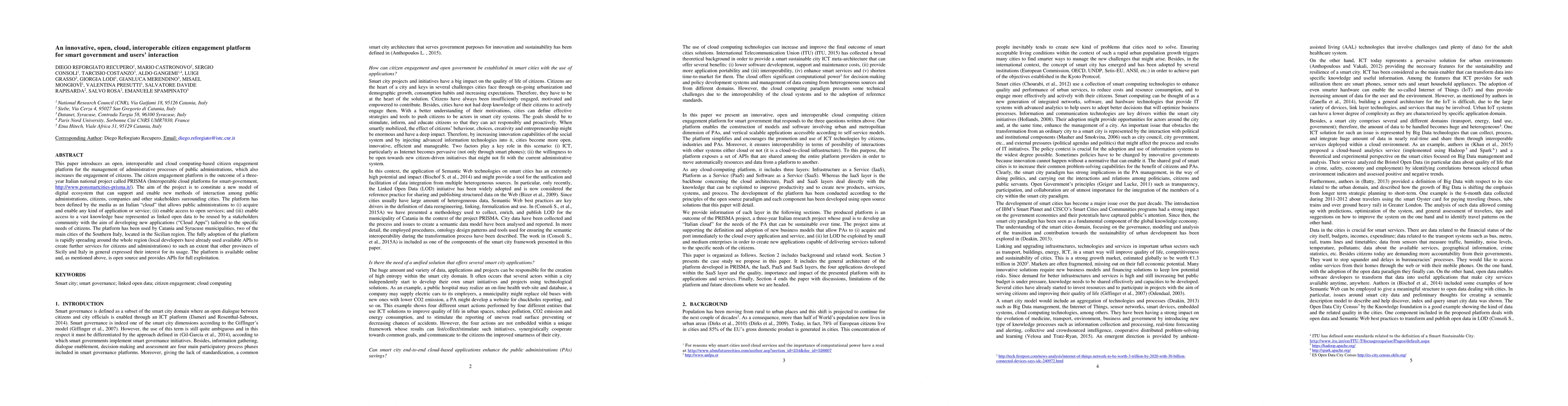 This paper introduces an open, interoperable, and cloud-computing-based citizen engagement platform for the management of administrative processes of public administrations, which also increases the engagement of citizens. The citizen engagement platform is the outcome of a 3-year Italian national project called PRISMA (Interoperable cloud platforms for smart government). The aim of the project is to constitute a new model of digital ecosystem that can support and enable new methods of interaction among public administrations, citizens, companies, and other stakeholders surrounding cities. The platform has been defined by the media as a flexible (enable the addition of any kind of application or service) and open (enable access to open services) Italian "cloud" that allows public administrations to access to a vast knowledge base represented as linked open data to be reused by a stakeholder community with the aim of developing new applications ("Cloud Apps") tailored to the specific needs of citizens. The platform has been used by Catania and Syracuse municipalities, two of the main cities of southern Italy, located in the Sicilian region. The fully adoption of the platform is rapidly spreading around the whole region (local developers have already used available application programming interfaces (APIs) to create additional services for citizens and administrations) to such an extent that other provinces of Sicily and Italy in general expressed their interest for its usage. The platform is available online and, as mentioned above, is open source and provides APIs for full exploitation.