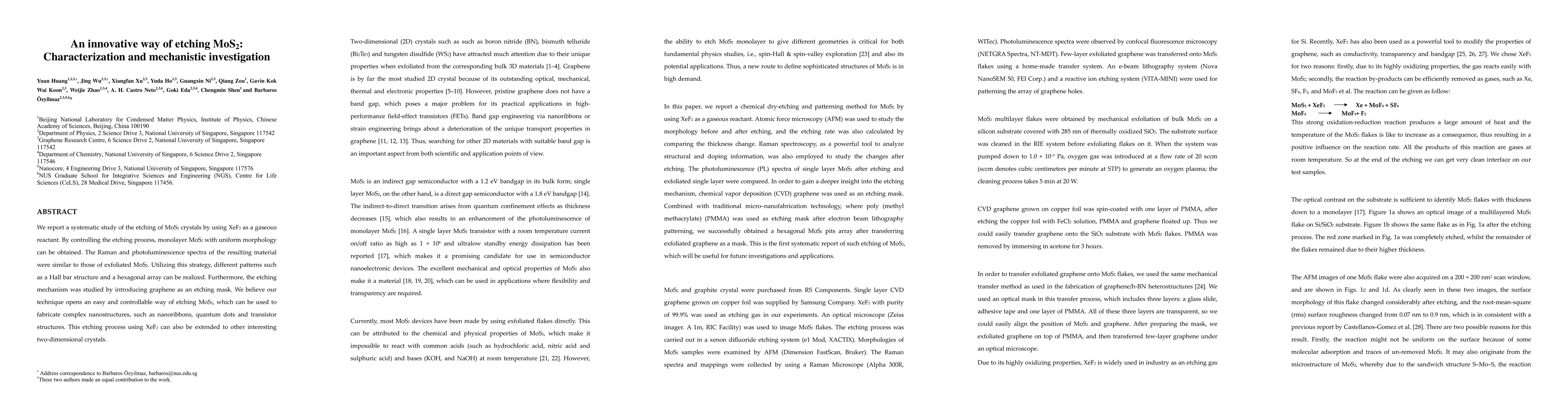 Summary: This study presents a controlled etching method for MoS2 crystals using XeF2 gas, resulting in uniform monolayers with characteristic Raman and photoluminescence spectra. The technique enables the fabrication of intricate patterns and offers insights into the etching mechanism, potentially extending to other 2D materials.