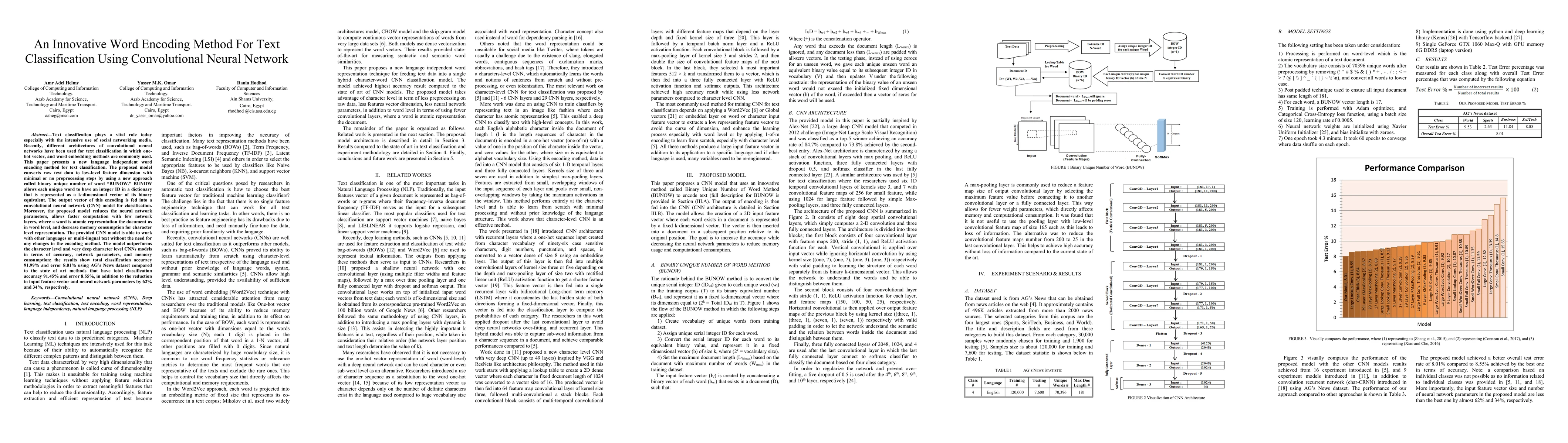 This paper introduces a novel word encoding method called BUNOW for text classification using CNNs, which converts words into binary vectors without extensive preprocessing. The BUNOW encoding is language-independent, reduces neural network parameters, and achieves higher classification accuracy (91.99%) and lower error (8.01%) compared to state-of-the-art methods.