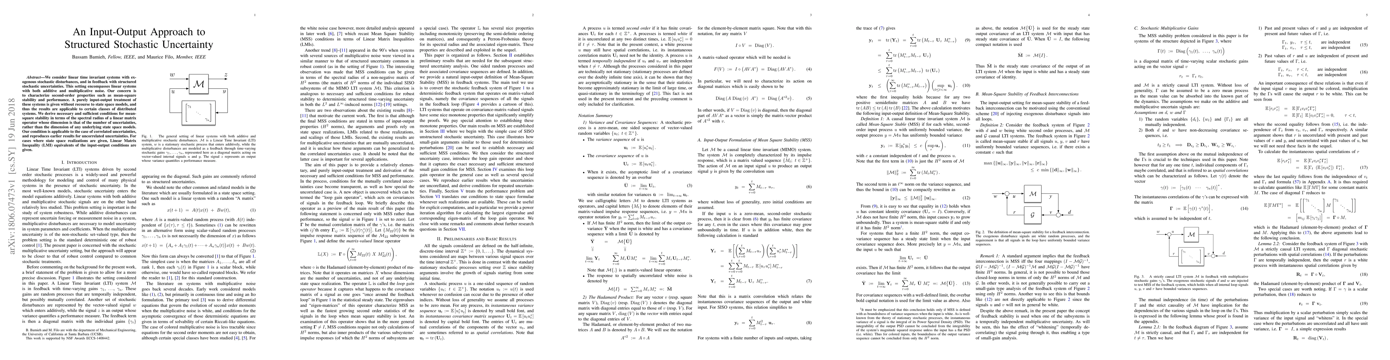We consider linear time invariant systems with exogenous stochastic disturbances, and in feedback with structured stochastic uncertainties. This setting encompasses linear systems with both additive and multiplicative noise. Our concern is to characterize second-order properties such as mean-square stability and performance. A purely input-output treatment of these systems is given without recourse to state space models, and thus the results are applicable to certain classes of distributed systems. We derive necessary and sufficient conditions for mean-square stability in terms of the spectral radius of a linear matrix operator whose dimension is that of the number of uncertainties, rather than the dimension of any underlying state space models. Our condition is applicable to the case of correlated uncertainties, and reproduces earlier results for uncorrelated uncertainties. For cases where state space realizations are given, Linear Matrix Inequality (LMI) equivalents of the input-output conditions are given.