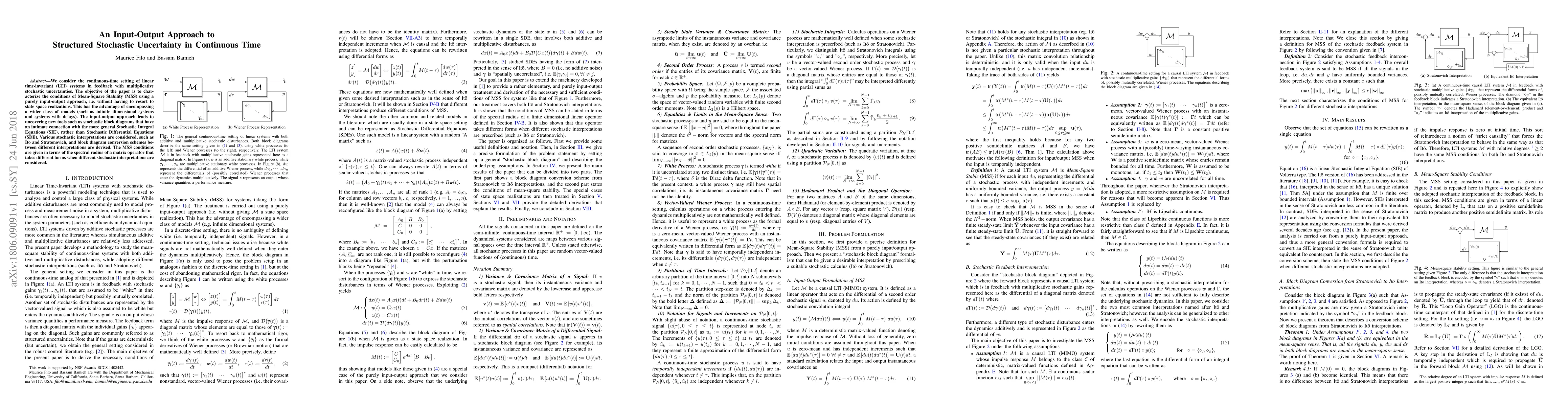 We consider the continuous-time setting of linear time-invariant (LTI) systems in feedback with multiplicative stochastic uncertainties. The objective of the paper is to characterize the conditions of Mean-Square Stability (MSS) using a purely input-output approach, i.e. without having to resort to state space realizations. This has the advantage of encompassing a wider class of models (such as infinite dimensional systems and systems with delays). The input-output approach leads to uncovering new tools such as stochastic block diagrams that have an intimate connection with the more general Stochastic Integral Equations (SIE), rather than Stochastic Differential Equations (SDE). Various stochastic interpretations are considered, such as It\=o and Stratonovich, and block diagram conversion schemes between different interpretations are devised. The MSS conditions are given in terms of the spectral radius of a matrix operator that takes different forms when different stochastic interpretations are considered.