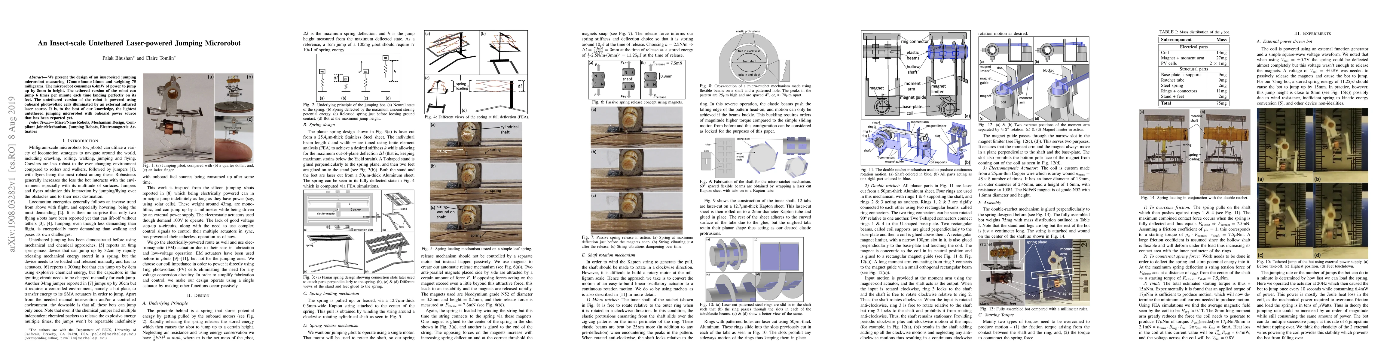 This paper introduces an insect-sized, 75 mg microrobot that can jump 8mm high with 6.4mW power, featuring both tethered and untethered versions, with the latter powered by photovoltaic cells and an external laser source. It claims to be the lightest untethered jumping microrobot with an onboard power source.