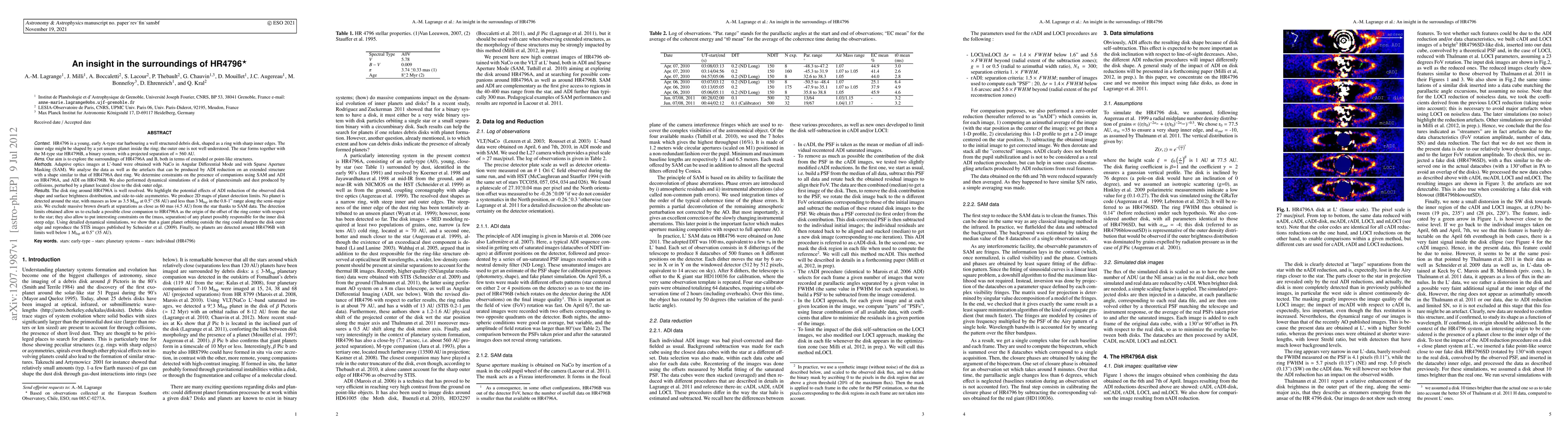 HR4796 is a young, early A-type star harbouring a well structured debris disk, shaped as a ring with sharp inner edges. It forms with the M-type star HR4796B a binary system, with a proj. sep. ~560 AU. Our aim is to explore the surroundings of HR4796A and B, both in terms of extended or point-like structures. Adaptive optics images at L'-band were obtained with NaCo in Angular Differential Mode and with Sparse Aperture Masking (SAM). We analyse the data as well as the artefacts that can be produced by ADI reduction on an extended structure with a shape similar to that of HR4796A dust ring. We determine constraints on the presence of companions using SAM and ADI on HR4796A, and ADI on HR4796B. We also performed dynamical simulations of a disk of planetesimals and dust produced by collisions, perturbed by a planet located close to the disk outer edge. The disk ring around HR4796A is well resolved. We highlight the potential effects of ADI reduction of the observed disk shape and surface brightness distribution, and side-to-side asymmetries. No planet is detected around the star, with masses as low as 3.5 M_Jup at 0.5" (58 AU) and less than 3 M_Jup in the 0.8-1" range along the semi-major axis. We exclude massive brown dwarfs at separations as close as 60 mas (4.5 AU) from the star thanks to SAM data. The detection limits obtained allow us to exclude a possible close companion to HR4796A as the origin of the offset of the ring center with respect to the star; they also allow to put interesting constraints on the (mass, separation) of any planet possibly responsible for the inner disk steep edge. Using detailed dynamical simulations, we show that a giant planet orbiting outside the ring could sharpen the disk outer edge and reproduce the STIS images published by Schneider et al. (2009).