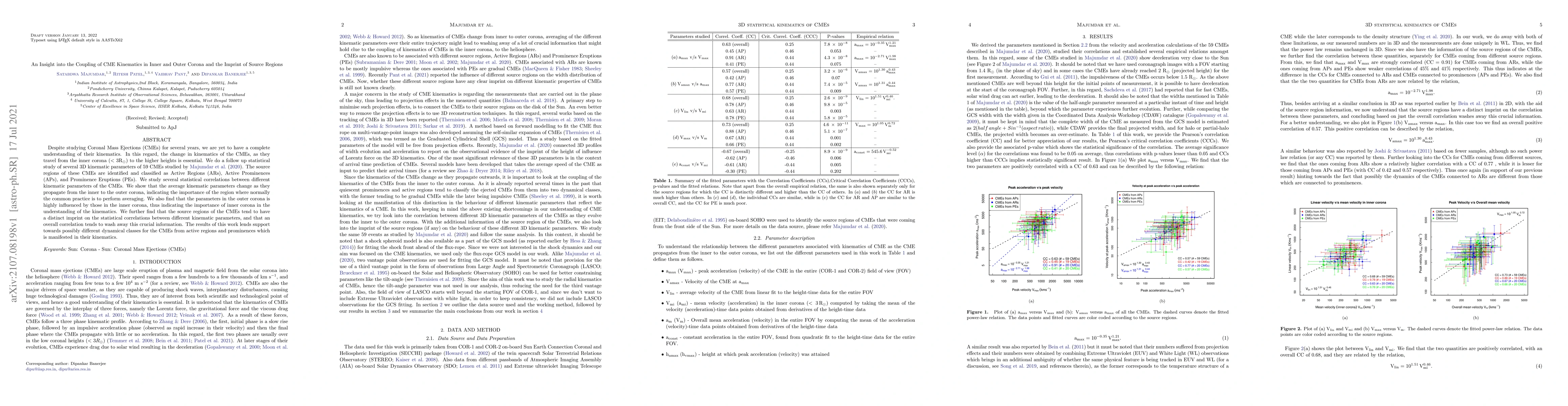 Despite studying Coronal Mass Ejections (CMEs) for several years, we are yet to have a complete understanding of their kinematics. In this regard, the change in kinematics of the CMEs, as they travel from the inner corona ($<$ 3R$_\odot)$ to the higher heights is essential. We do a follow up statistical study of several 3D kinematic parameters of 59 CMEs studied by Majumdar et al. (2020). The source regions of these CMEs are identified and classified as Active Regions (ARs), Active Prominences (APs), and Prominence Eruptions (PEs). We study several statistical correlations between different kinematic parameters of the CMEs. We show that the average kinematic parameters change as they propagate from the inner to the outer corona, indicating the importance of the region where normally the common practice is to perform averaging. We also find that the parameters in the outer corona is highly influenced by those in the inner corona, thus indicating the importance of inner corona in the understanding of the kinematics. We further find that the source regions of the CMEs tend to have a distinct imprint on the statistical correlations between different kinematic parameters, and that an overall correlation tends to wash away this crucial information. The results of this work lends support towards possibly different dynamical classes for the CMEs from active regions and prominences which is manifested in their kinematics.