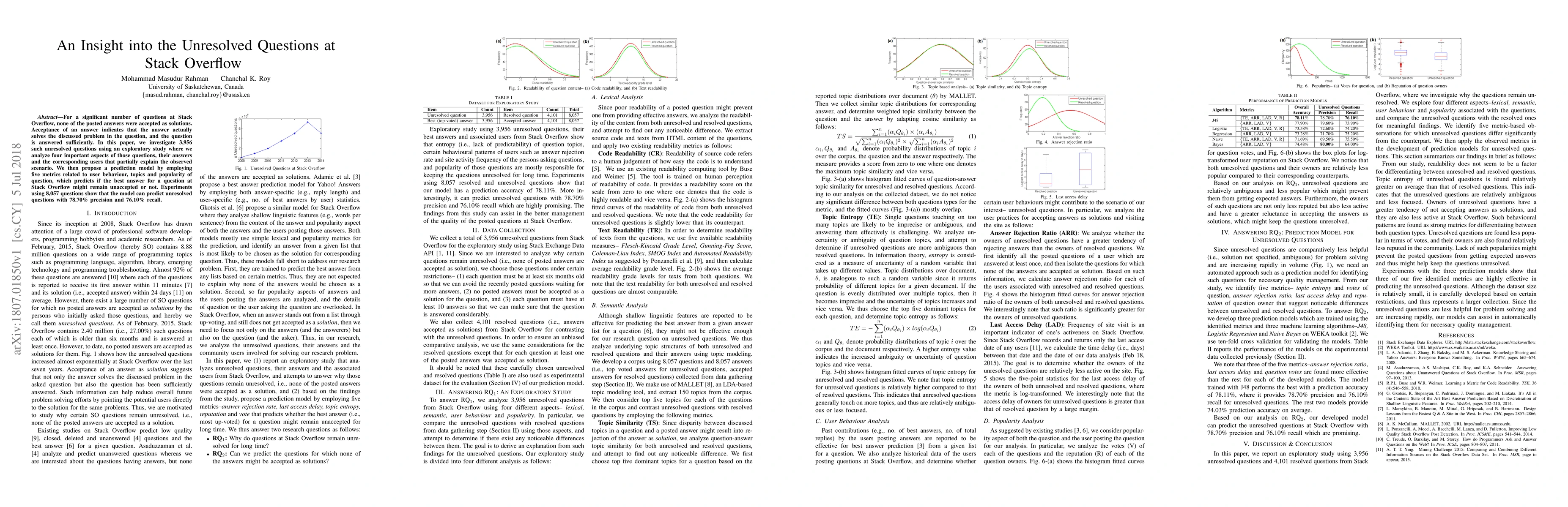 This paper explores unresolved questions on Stack Overflow where no answers were accepted, analyzing 3,956 such questions to identify factors contributing to this phenomenon. It proposes a predictive model using five metrics to forecast whether a question's best answer might remain unaccepted, achieving 78.70% precision and 76.10% recall in experiments.