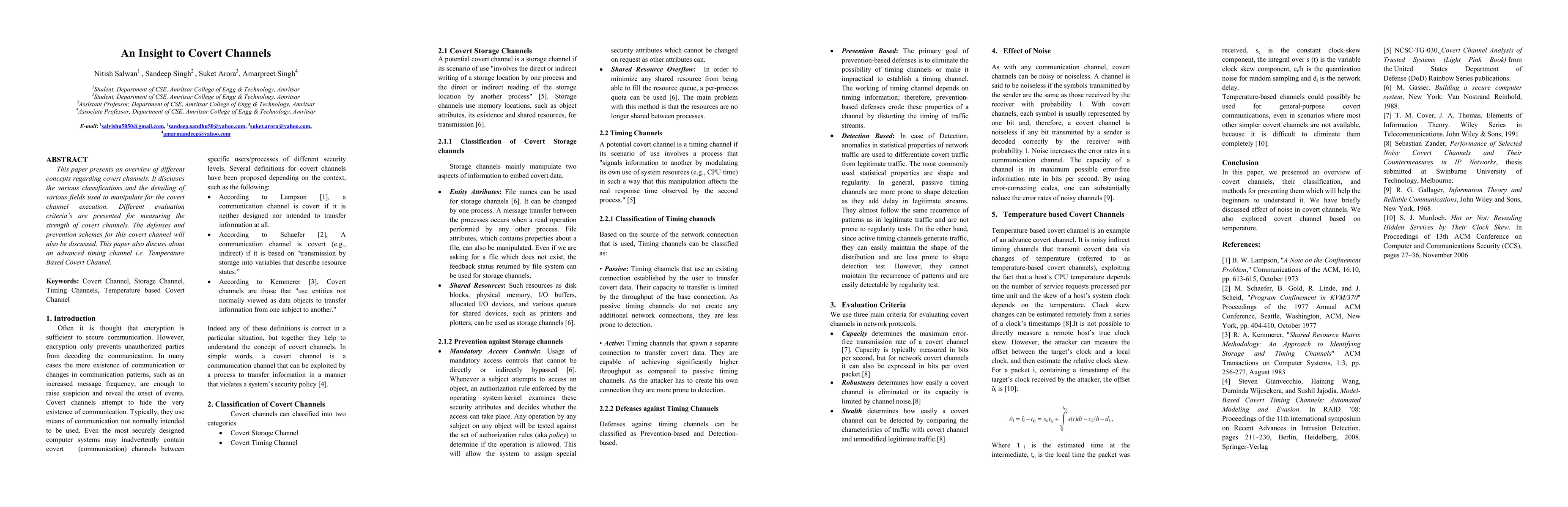 This paper provides an overview of covert channels, detailing their classifications, manipulation techniques, and evaluation criteria. It also explores advanced timing channels, specifically temperature-based covert channels, along with defenses and prevention strategies.
