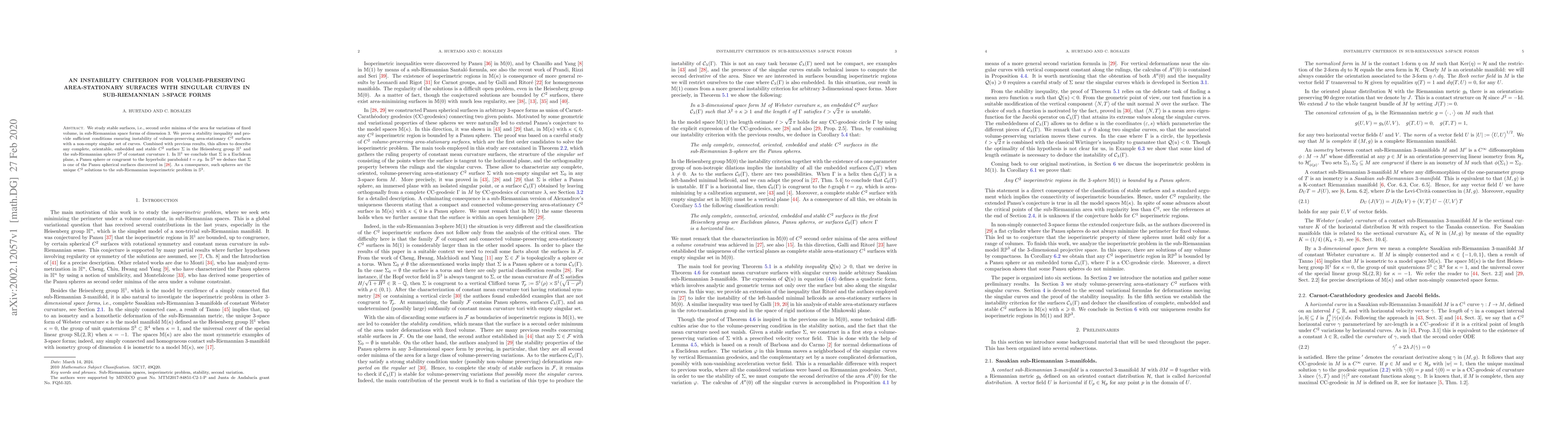 This paper establishes an instability criterion for volume-preserving area-stationary surfaces in sub-Riemannian 3-space forms, identifying conditions under which such surfaces become unstable. It concludes that in specific sub-Riemannian geometries, stable surfaces are either Euclidean planes, Pansu spheres, hyperbolic paraboloids, or Pansu spherical surfaces.