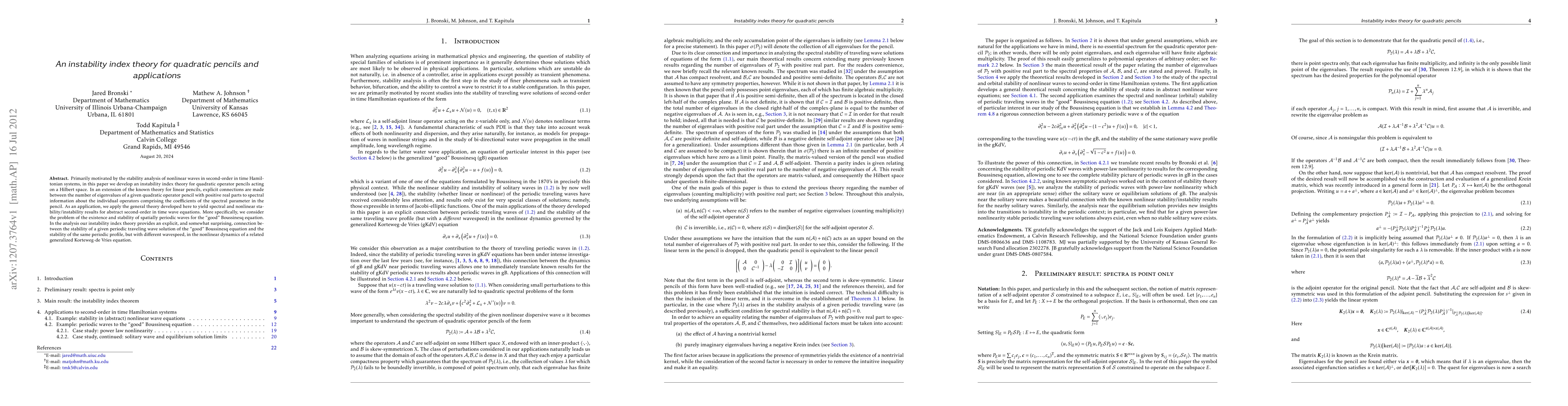 Primarily motivated by the stability analysis of nonlinear waves in second-order in time Hamiltonian systems, in this paper we develop an instability index theory for quadratic operator pencils acting on a Hilbert space. In an extension of the known theory for linear pencils, explicit connections are made between the number of eigenvalues of a given quadratic operator pencil with positive real parts to spectral information about the individual operators comprising the coefficients of the spectral parameter in the pencil. As an application, we apply the general theory developed here to yield spectral and nonlinear stability/instability results for abstract second-order in time wave equations. More specifically, we consider the problem of the existence and stability of spatially periodic waves for the "good" Boussinesq equation. In the analysis our instability index theory provides an explicit, and somewhat surprising, connection between the stability of a given periodic traveling wave solution of the "good" Boussinesq equation and the stability of the same periodic profile, but with different wavespeed, in the nonlinear dynamics of a related generalized Korteweg-de Vries equation.