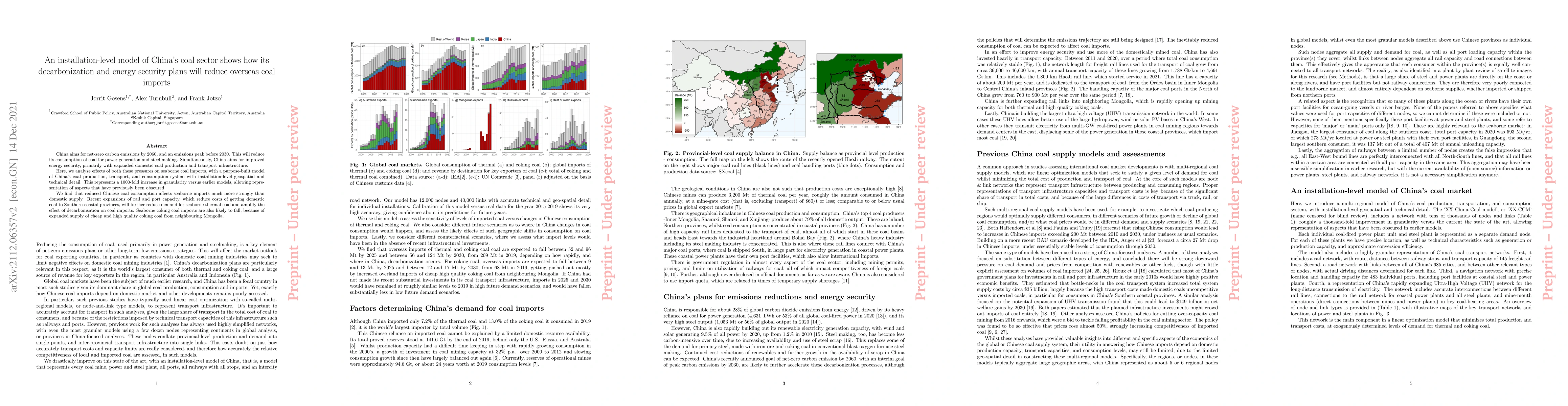 China aims for net-zero carbon emissions by 2060, and an emissions peak before 2030. This will reduce its consumption of coal for power generation and steel making. Simultaneously, China aims for improved energy security, primarily with expanded domestic coal production and transport infrastructure. Here, we analyze effects of both these pressures on seaborne coal imports, with a purpose-built model of China's coal production, transport, and consumption system with installation-level geospatial and technical detail. This represents a 1000-fold increase in granularity versus earlier models, allowing representation of aspects that have previously been obscured. We find that reduced Chinese coal consumption affects seaborne imports much more strongly than domestic supply. Recent expansions of rail and port capacity, which reduce costs of getting domestic coal to Southern coastal provinces, will further reduce demand for seaborne thermal coal and amplify the effect of decarbonisation on coal imports. Seaborne coking coal imports are also likely to fall, because of expanded supply of cheap and high quality coking coal from neighbouring Mongolia.