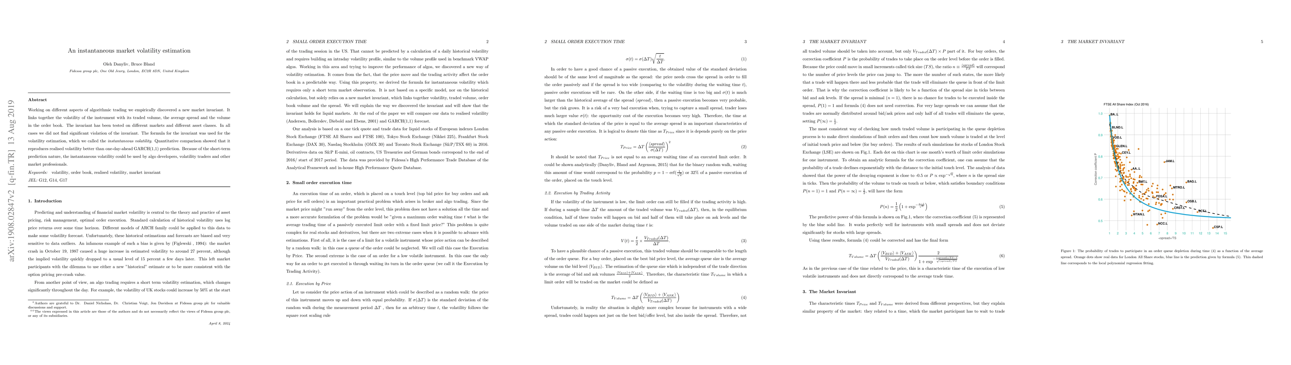 Working on different aspects of algorithmic trading we empirically discovered a new market invariant. It links together the volatility of the instrument with its traded volume, the average spread and the volume in the order book. The invariant has been tested on different markets and different asset classes. In all cases we did not find significant violation of the invariant. The formula for the invariant was used for the volatility estimation, which we called the instantaneous volatility. Quantitative comparison showed that it reproduces realised volatility better than one-day-ahead GARCH(1,1) prediction. Because of the short-term prediction nature, the instantaneous volatility could be used by algo developers, volatility traders and other market professionals.