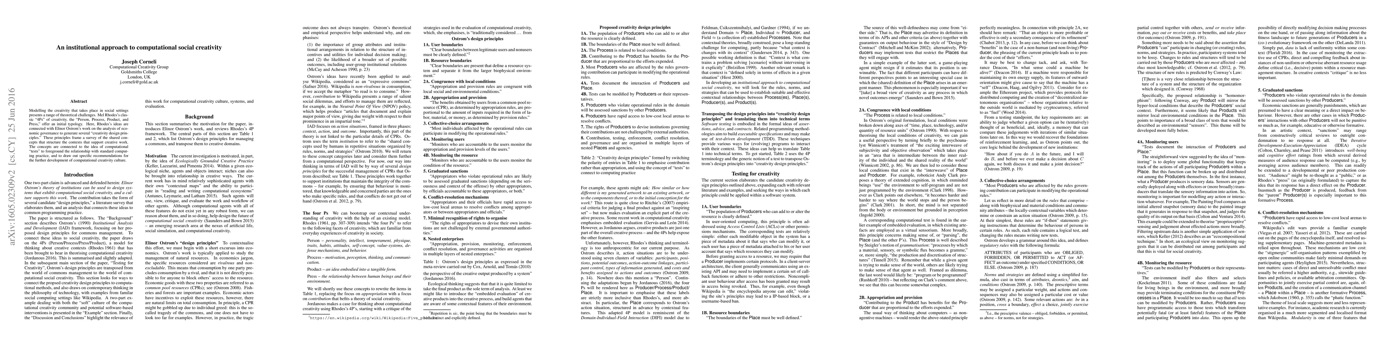 Modelling the creativity that takes place in social settings presents a range of theoretical challenges. Mel Rhodes's classic "4Ps" of creativity, the "Person, Process, Product, and Press," offer an initial typology. Here, Rhodes's ideas are connected with Elinor Ostrom's work on the analysis of economic governance to generate several "creativity design principles." These principles frame a survey of the shared concepts that structure the contexts that support creative work. The concepts are connected to the idea of computational "tests" to foreground the relationship with standard computing practice, and to draw out specific recommendations for the further development of computational creativity culture.