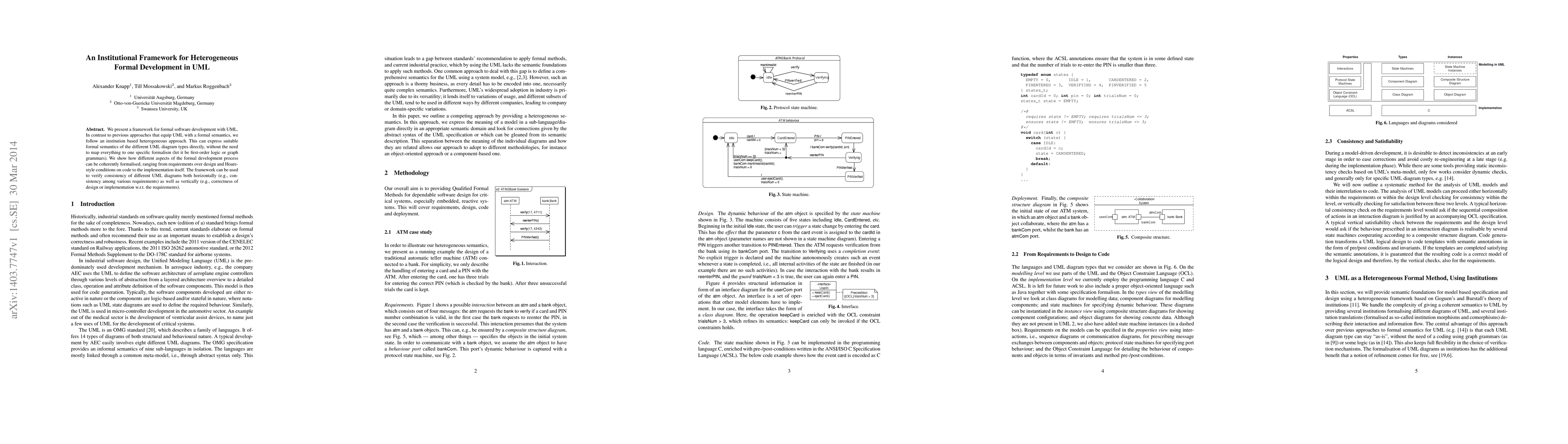 This paper introduces an institution-based framework for formal software development using UML, allowing direct expression of formal semantics for different UML diagram types without uniform mapping. The framework enables coherent formalization and verification of consistency across various stages of development from requirements to implementation.