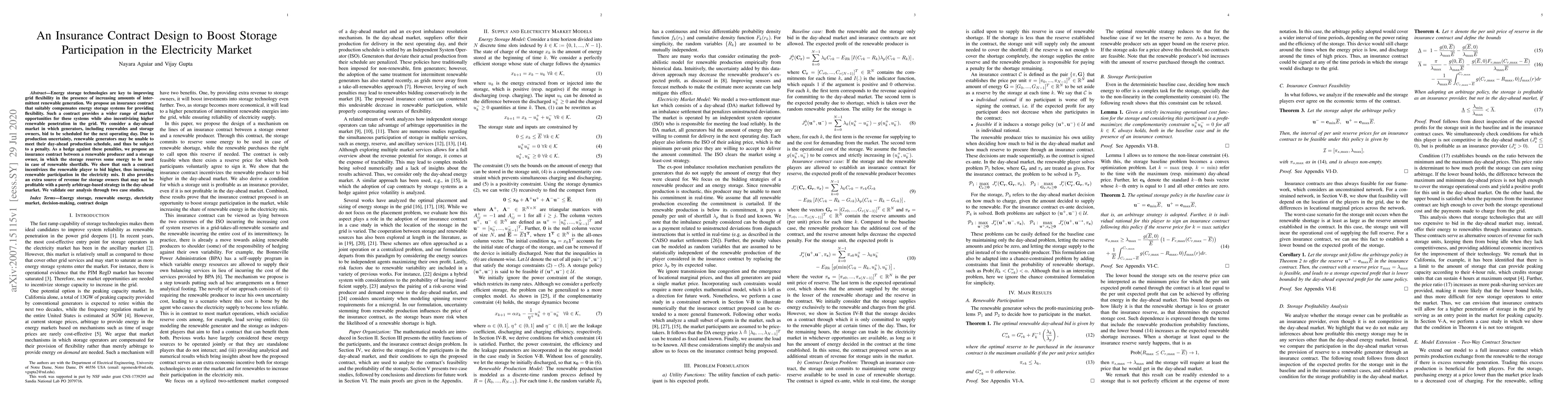 This paper proposes an insurance contract to incentivize energy storage systems to provide grid flexibility, thereby boosting renewable energy participation. The contract hedges against penalties for renewable generators by allowing storage owners to reserve energy for shortfalls, increasing both renewable bid levels and storage profitability.