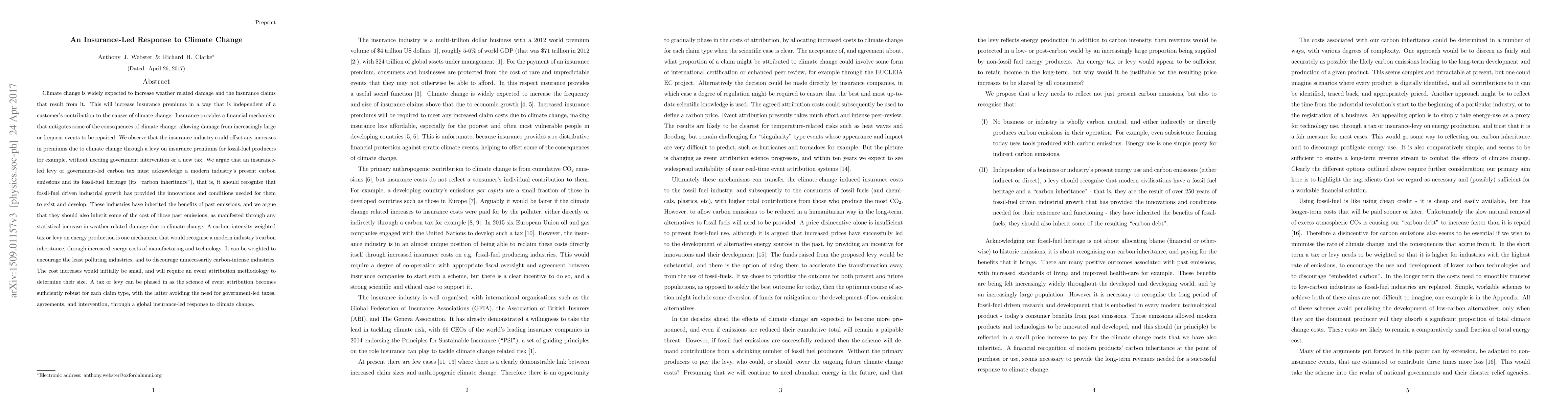 This paper proposes that the insurance industry can mitigate climate change impacts by increasing premiums on energy producers, thereby creating an insurance-led levy that acknowledges both current carbon emissions and the carbon inheritance from fossil-fuel driven industrial growth. This approach aims to provide a global response to climate change without requiring government intervention.