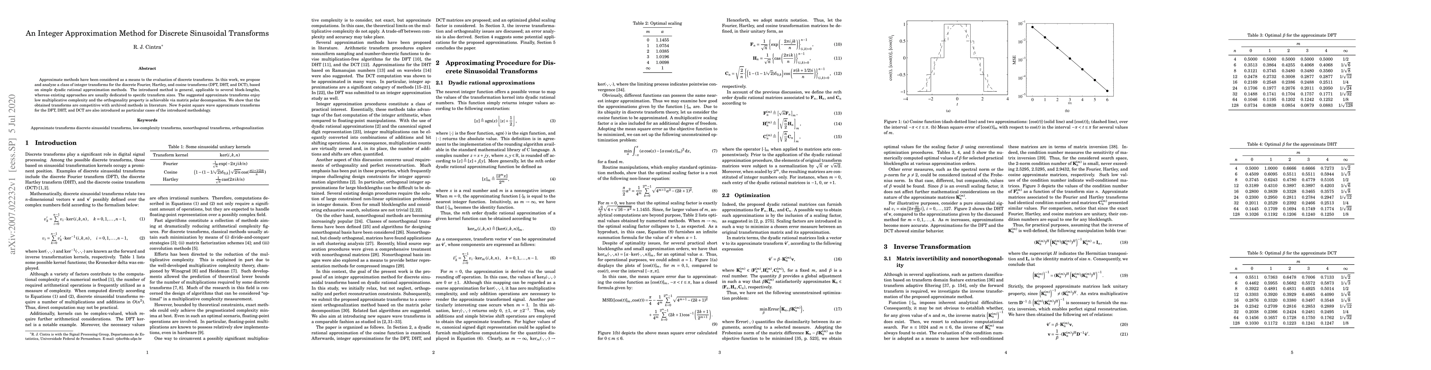 This paper proposes a new integer approximation method for discrete sinusoidal transforms, including DFT, DHT, and DCT, using dyadic rational approximations. It demonstrates low multiplicative complexity and maintains orthogonality through matrix polar decomposition, offering competitive performance compared to existing methods.