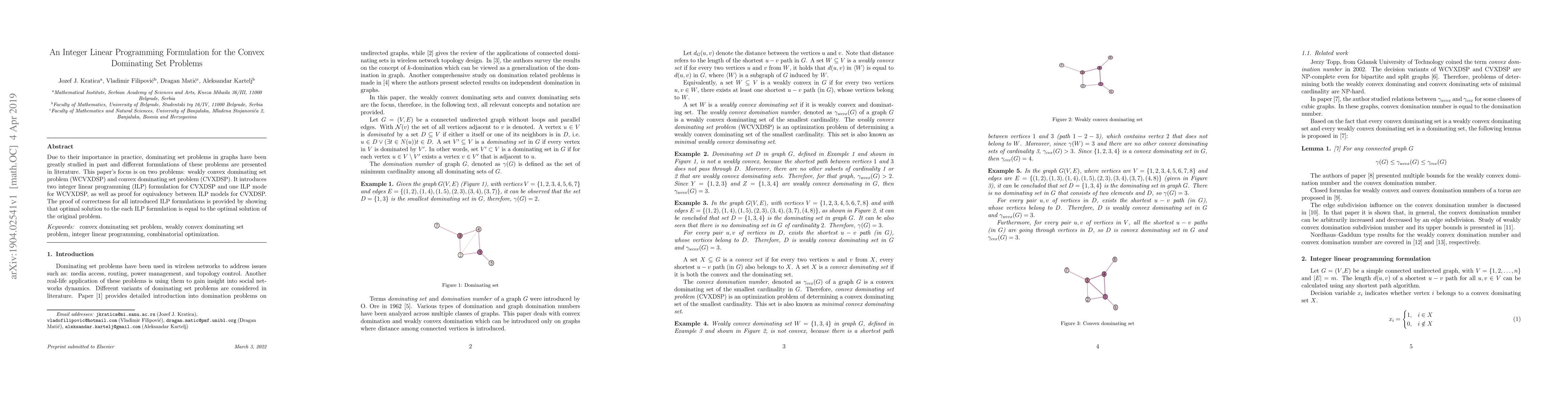 This paper presents integer linear programming formulations for the weakly convex dominating set problem (WCVXDSP) and convex dominating set problem (CVXDSP), proving equivalency between the ILP models for CVXDSP and demonstrating the correctness of all formulations by showing they yield the same optimal solutions as the original problems.